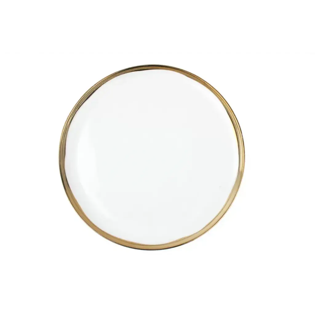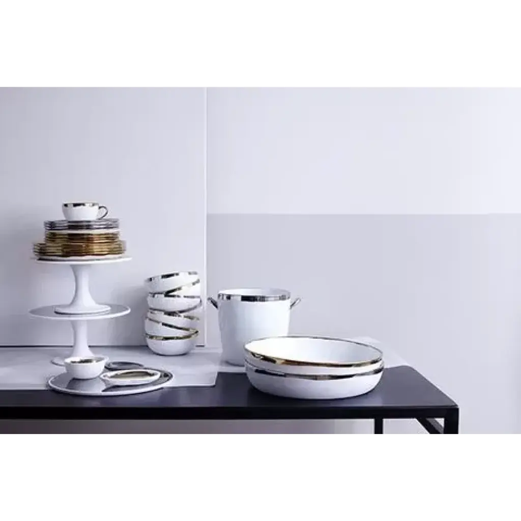 The Dauville Collection exhibits a contrast between creamy textured finish and bold metallic glaze, which in turns yields a unique harmony of glamour and subtlety. Each piece features a contemporary shape and distinctive free-form coating. Perfect for entertaining your guests with artisan sophistication and poise. Handmade. Porcelain with hand-painted metallic gold or platinum rims. Bottom is unglazed. Imported.