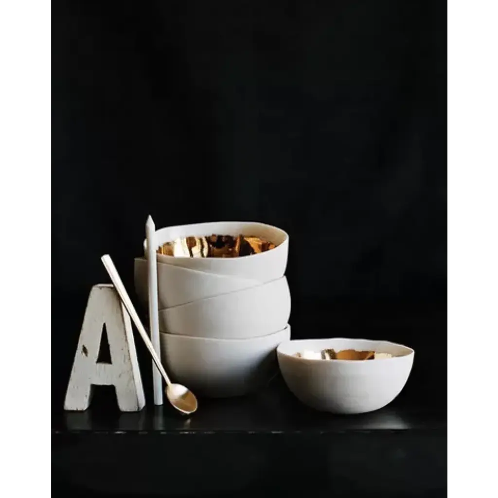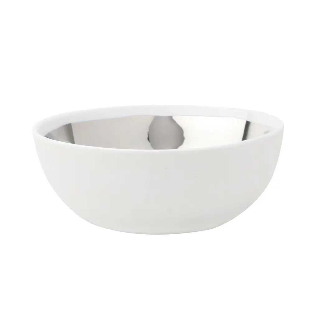 The Dauville Collection is a unique combination of glamour and subtlety. The exterior is a creamy textured bisque finish which contrasts with the shiny gold or platinum interior. The purposefully irregular metallic glazing reflects the artisan influence of these hostess items. Handmade. Porcelain with hand-painted metallic gold or platinum rims. Exterior is unglazed. Imported.