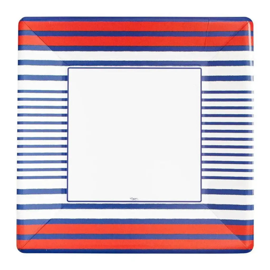 Ooh la la! Inspired by the iconic french breton stripe, these foil-pressed plates are anything but basic. Let them stand alone or mix and match with another pattern to create your own look! Package contains 8 paper platesEach plate measures approximately 9.5 inches from corner to cornerNot safe for microwave use