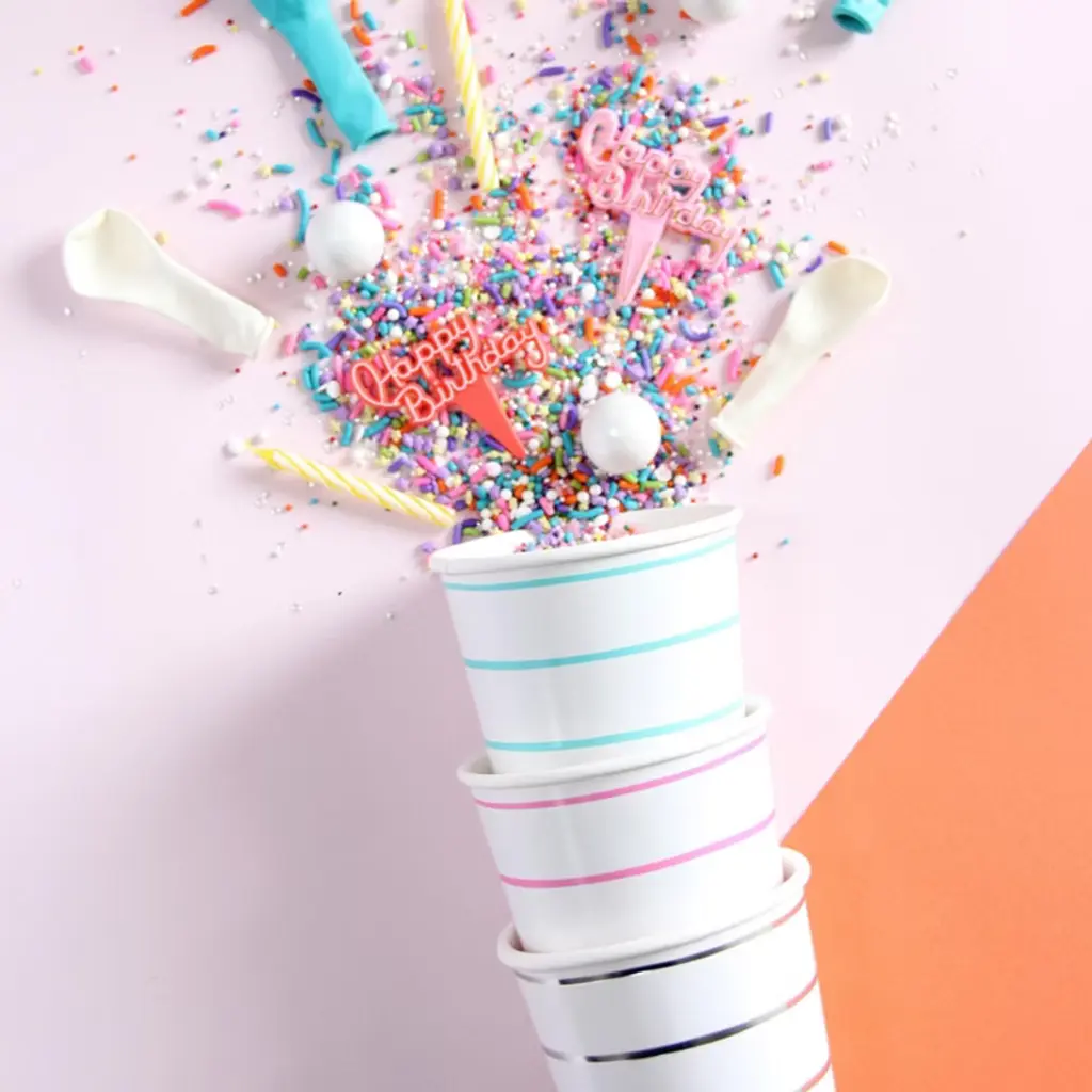 Ooh la la! Inspired by the iconic French Breton stripe, these striped paper cups are anything but basic. Let them stand alone or mix and match with another pattern to create your own stylish party look!’ Package contains 8 paper cups 9 oz. capacity Each cup measures approximately 3.5 inches tall + 3 inches wide Suitable for hot or cold beverages, withstanding temperatures up to 90-100°f Not safe for microwave use
