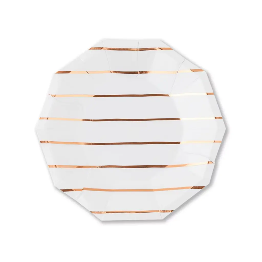 Ooh la la! Inspired by the iconic french breton stripe, these foil-pressed plates are anything but basic. Let them stand alone or mix and match with another pattern to create your own look! Package contains 8 paper platesEach plate measures approximately 7.5 inches from corner to cornerNot safe for microwave use