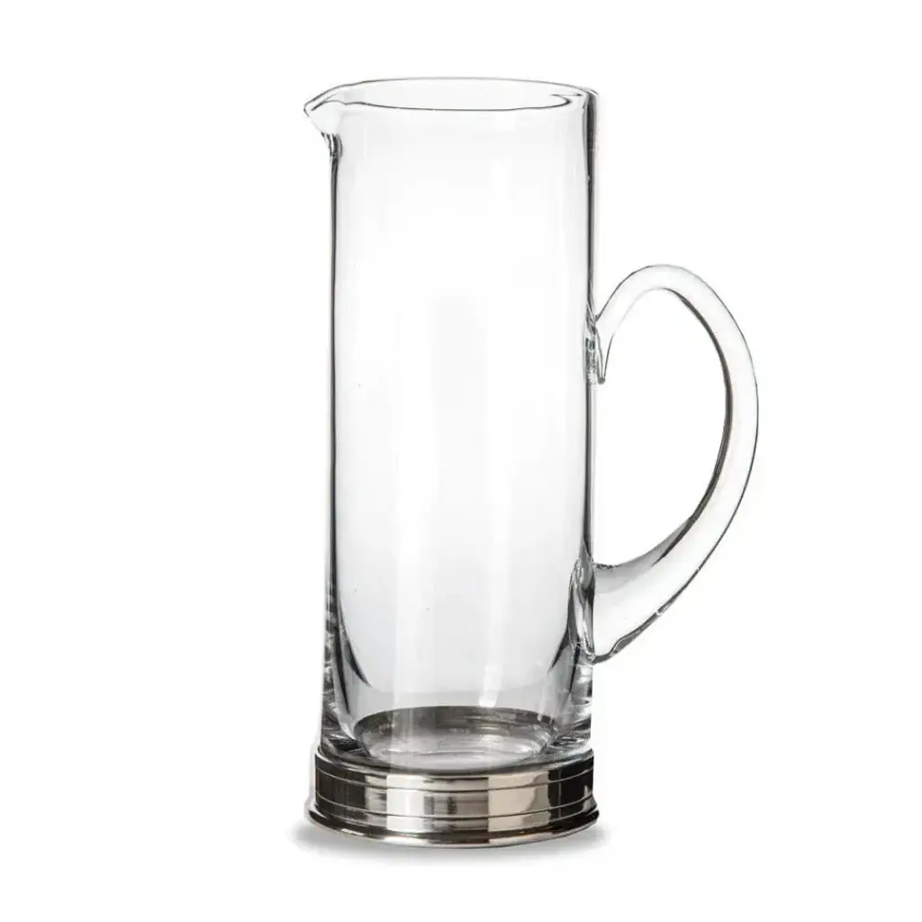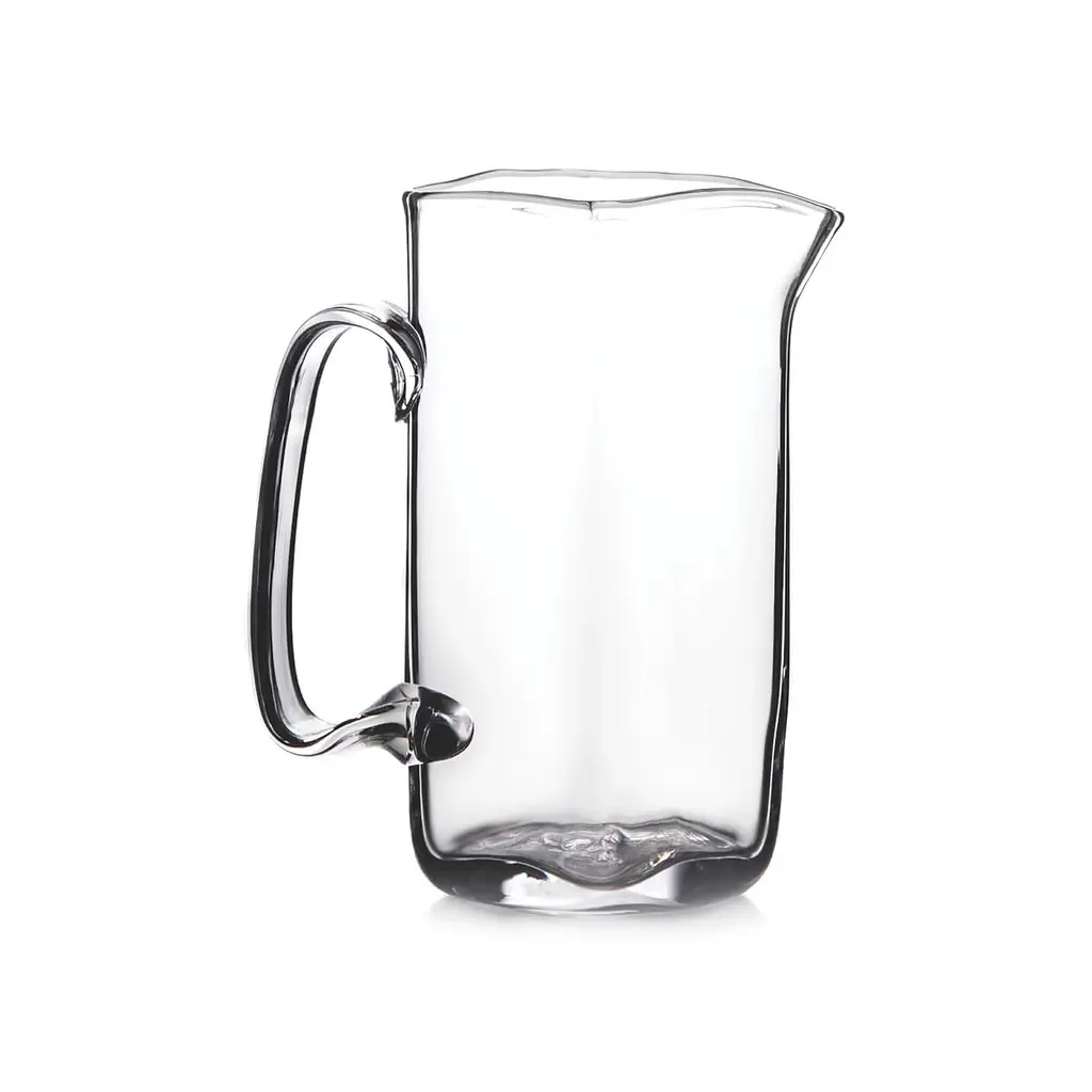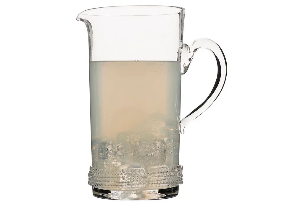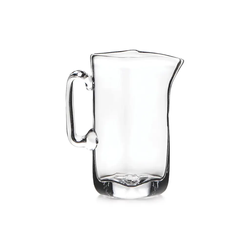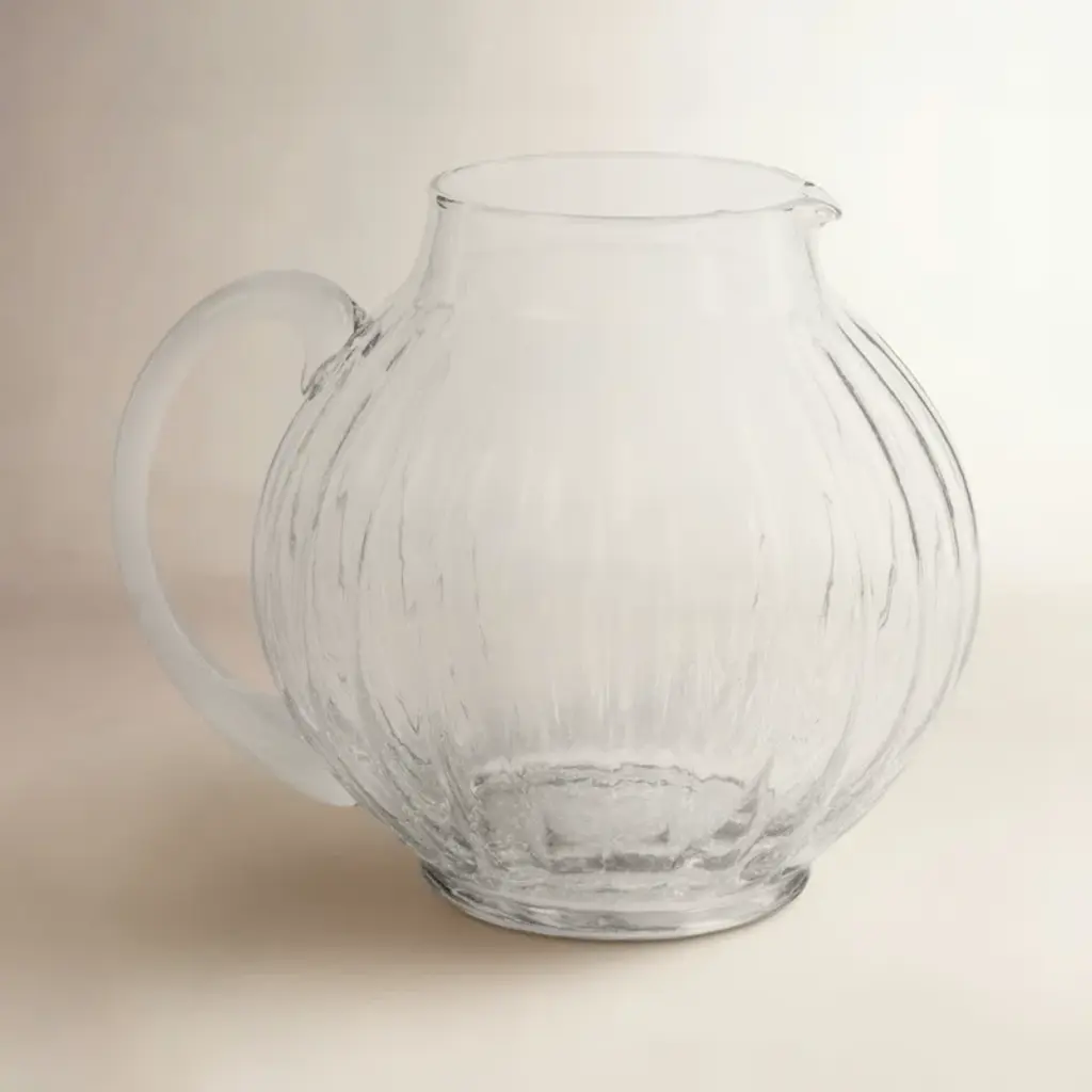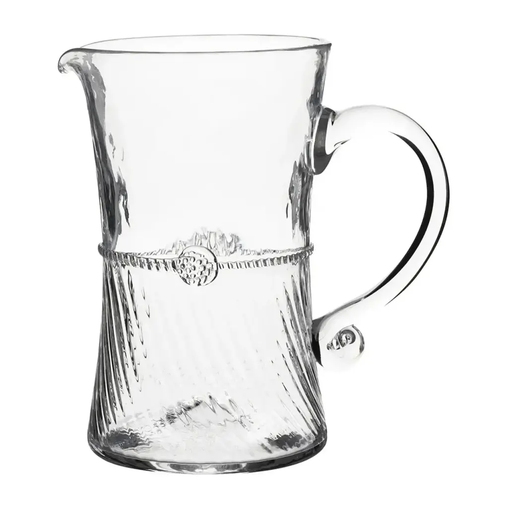 Sleek and chic, this pitcher is mouth-blown of glass with two textural, rope-like detailing at its base.
