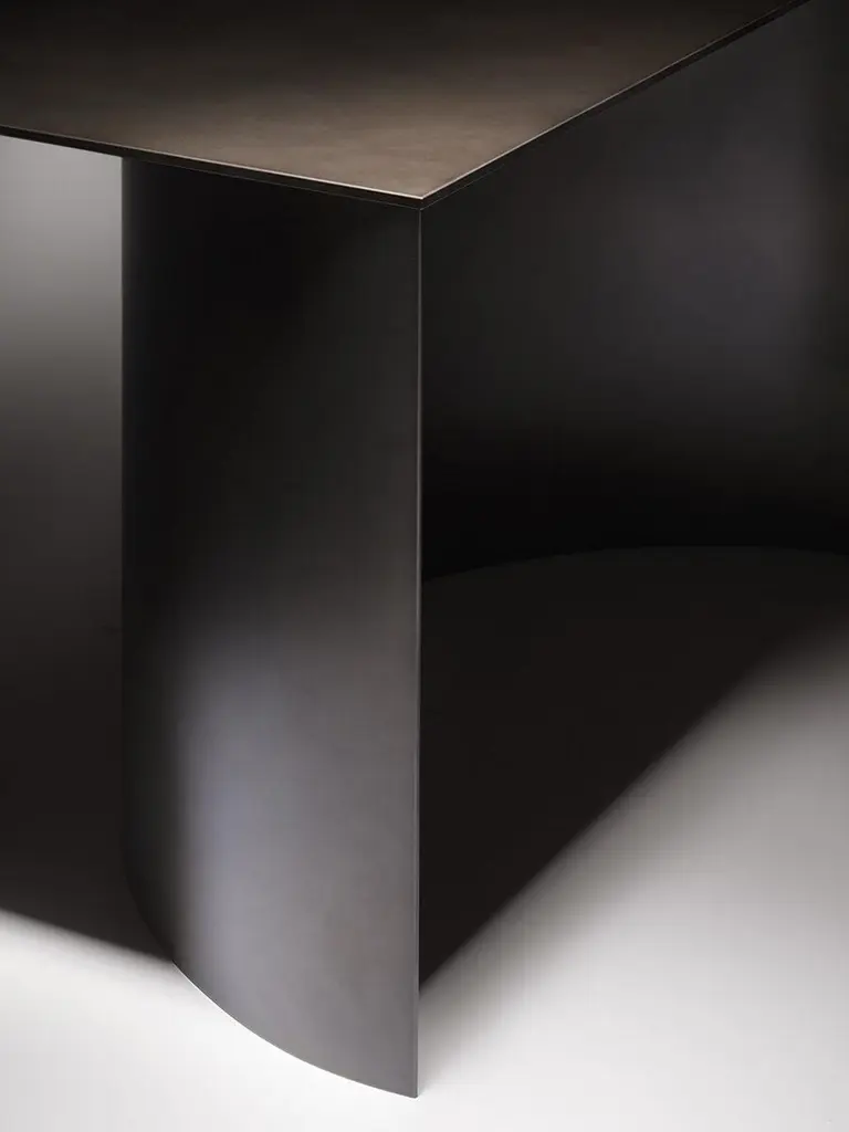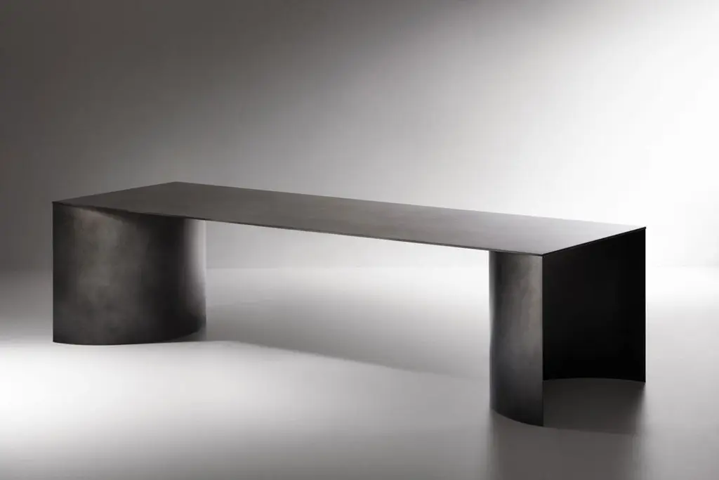 A sculptural presence and essential minimalism are the identifying characteristics of this table, made of just three elements: a thick rectangular top which rests on two large concave semi-cylinders, creating a pedestal. The pure, monolithic lines are initially determined by functionality and technique, then by aesthetics, to create a shape that is the maximum expression of the rigour and understatement of proportional harmony.BASE-STRUCTURE IN INOX / TOP IN DELABRE B ALUMINIUM EQUIPPED WITH TRANSPARENT PROTECTIVE FILM