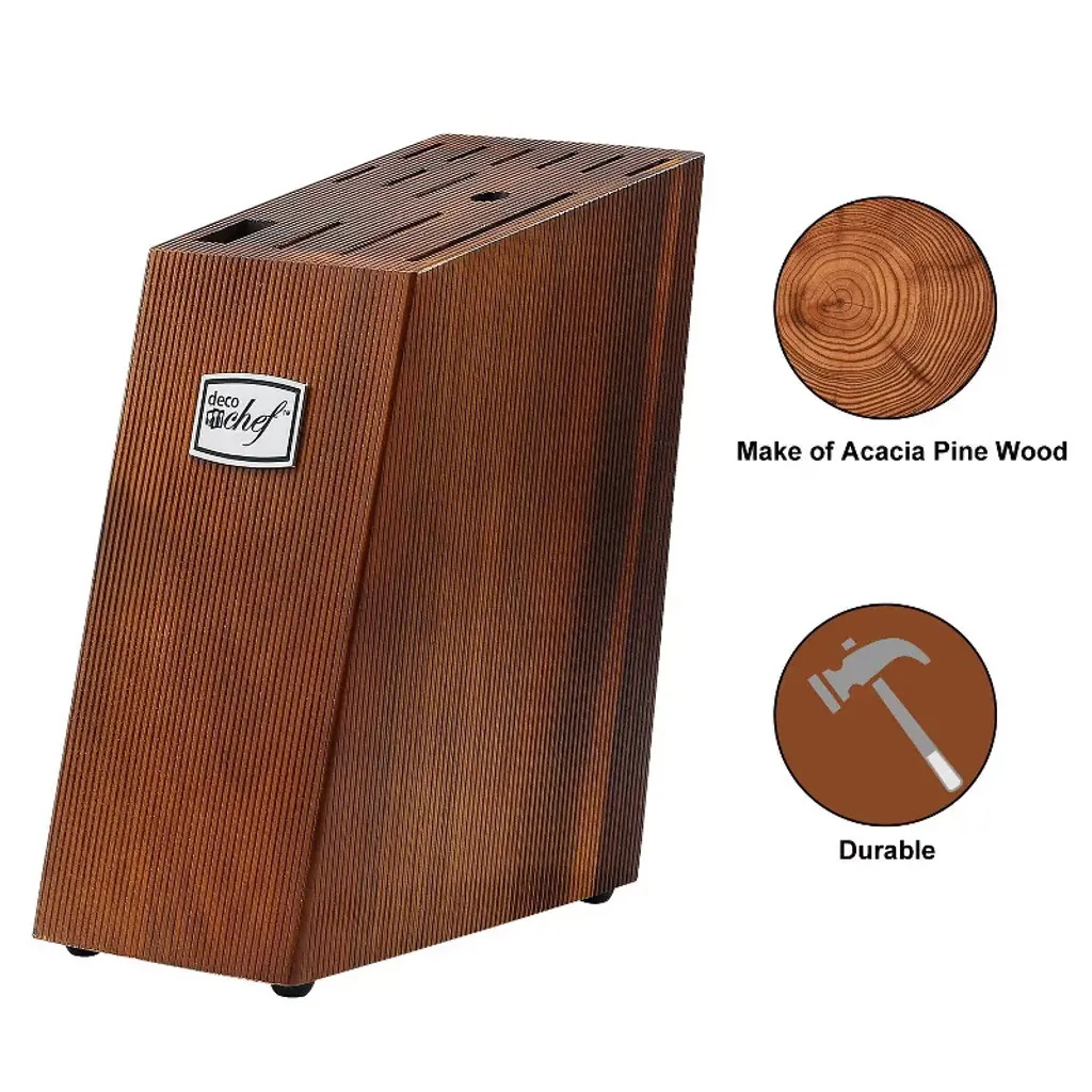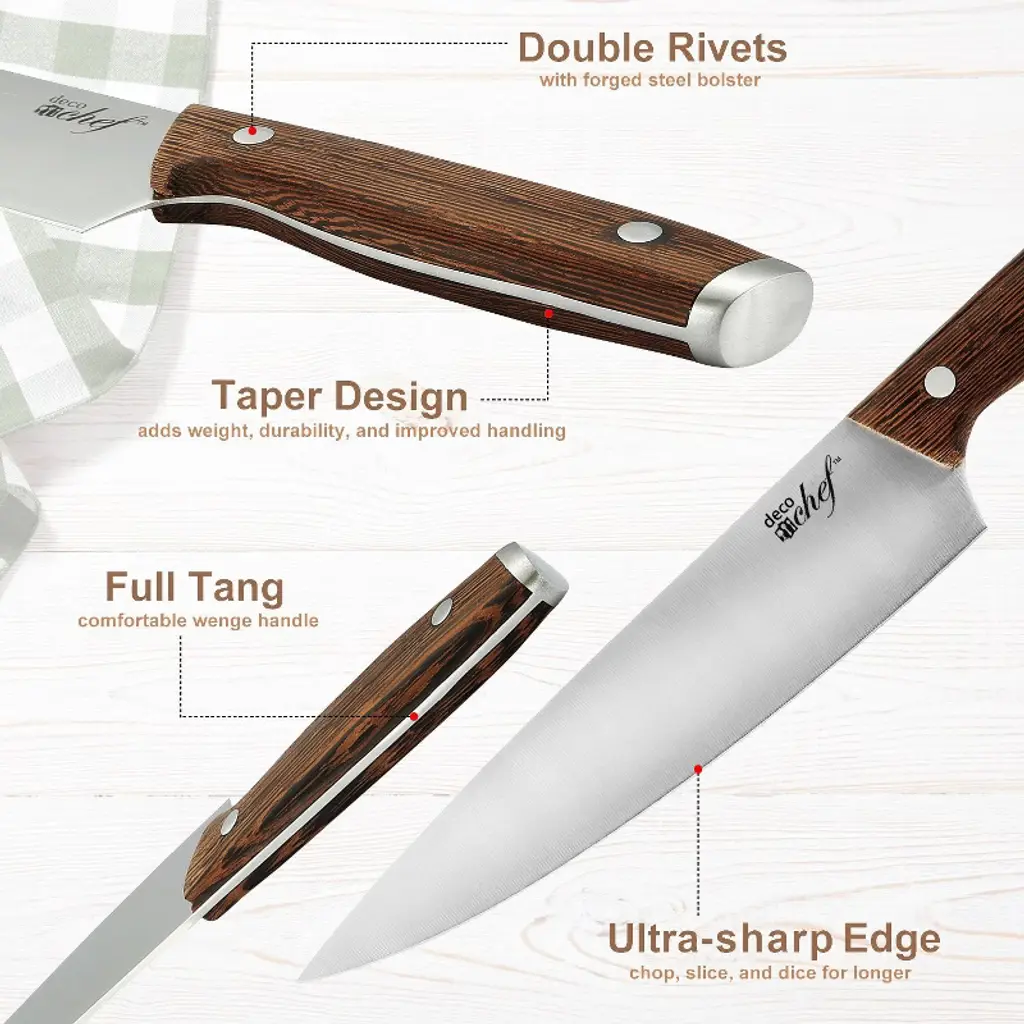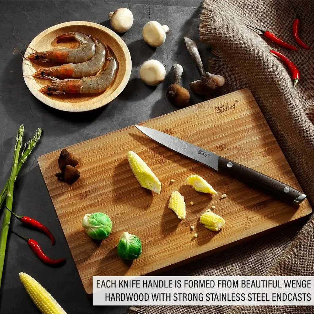 The Deco Chef 16-Piece Knife Set brings a complete cutlery package to your kitchen so you can take meal prep - and cooking enjoyment - to the next level. Each blade is comprised of high-grade 3Cr13 stainless steel that fights off rust and holds its sharp cutting edge longer. Thanks to their high strength, you can confidently tackle cutting, chopping, slicing, and dicing tasks with ease. And because they are stainless steel, hand wash cleanup is simple! Each knife handle is formed from beautiful wenge hardwood with strong 430 stainless steel endcasts. Using a full tang blade, a design that features one solid piece of metal from tip to grip, users can cut with confidence and precision. Balanced, comfortable to hold, and ergonomically shaped, these handles allow you to make cuts for longer while easing soreness and pain. Proudly display your knife set on the counter for easy access and organization. Each knife has a home in a solid acacia pinewood block using precisely sized slots that fits each type of knife. Practical, beautiful, and keeps your knives safe. Additionally, you'll get a bamboo cutting board that's more resistant to cuts and bacteria.