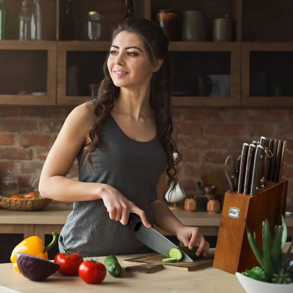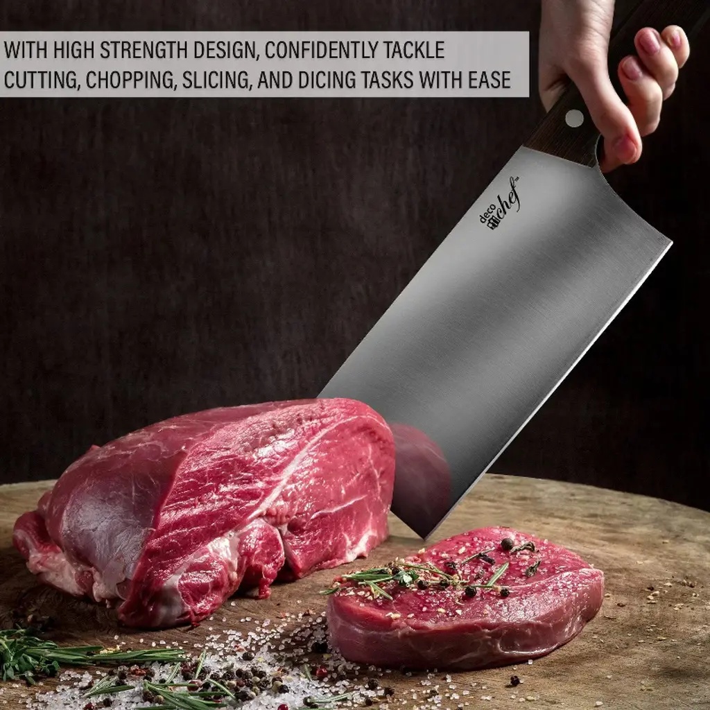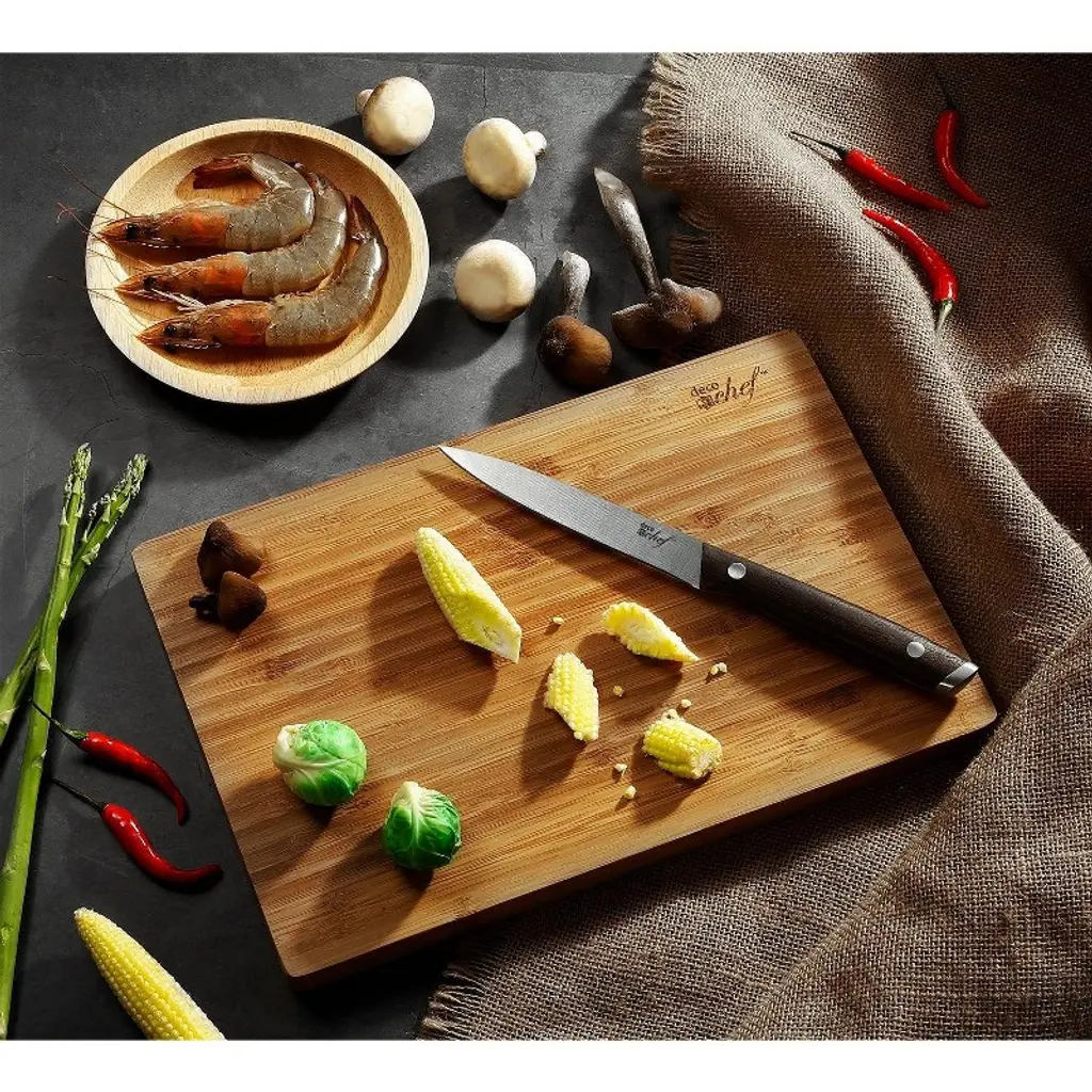 The Deco Chef 16-Piece Knife Set brings a complete cutlery package to your kitchen so you can take meal prep - and cooking enjoyment - to the next level. Each blade is comprised of high-grade 3Cr13 stainless steel that fights off rust and holds its sharp cutting edge longer. Thanks to their high strength, you can confidently tackle cutting, chopping, slicing, and dicing tasks with ease. And because they are stainless steel, hand wash cleanup is simple! Each knife handle is formed from beautiful wenge hardwood with strong 430 stainless steel endcasts. Using a full tang blade, a design that features one solid piece of metal from tip to grip, users can cut with confidence and precision. Balanced, comfortable to hold, and ergonomically shaped, these handles allow you to make cuts for longer while easing soreness and pain. Proudly display your knife set on the counter for easy access and organization. Each knife has a home in a solid acacia pinewood block using precisely sized slots that fits each type of knife. Practical, beautiful, and keeps your knives safe. Additionally, you'll get a bamboo cutting board that's more resistant to cuts and bacteria.
