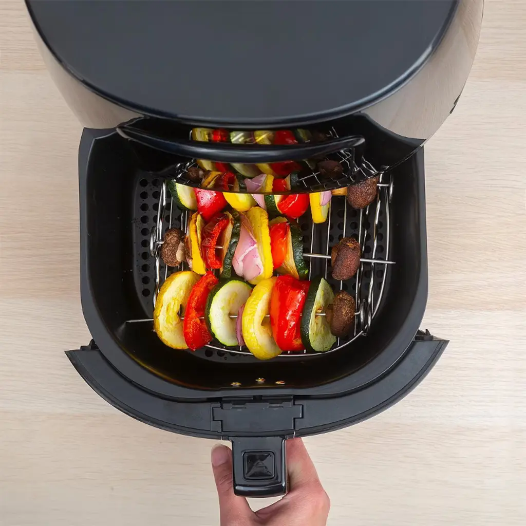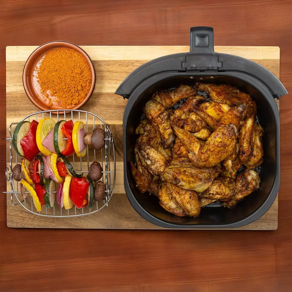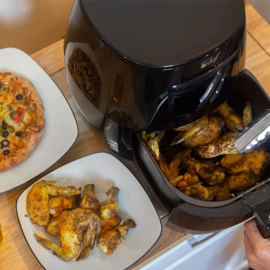 Everyone has a schedule to balance - with less free time and more responsibilities, it’s easy to lose healthy and efficient cooking habits. Electric air frying is here to help. Take back your free time with the Deco Chef Digital 5L Electric Air Fryer as you fry, sauté, bake, and grill your way to healthier meals with less prep and less waiting. Create fast foods with all of the taste and none of the guilt. Whether you’re streamlining your meal prep process or making healthier French fries, this electric air fryer makes cooking a joy. Fantastic cooking is now made easy thanks to a user-friendly digital display. This large, sleek interface provides the user with simple readouts and control access. Use one of 6 preset modes or enter your own cooking settings and you’ll have fantastic food ready in no time. With 1400 watts of power, this air fryer needs little oil or none at all. Power packed, you’ll healthily cook meats or vegetables to crispy perfection on the outside and juicy tenderness on the inside. When your meals are finished, the cooking basket is removed with the press of a button on the safe-to-touch grab handle. Installed auto-shutoff technology keeps your food from over-cooking and getting too hot. A detachable non-stick frying surface makes clean-up an afterthought. BPA and PFOA free. Included is the official Deco Chef cookbook that includes 17 mouthwatering recipes for your electric air fryer. Including breakfasts, lunches, desserts, and snacks, it’s the perfect complement to get your expedition into the air fryer world started. Additionally, you get a pizza pan, BBQ rack, and skewers. Features NOT JUST FRYING – Roast, bake, grill, fry, or stew using up to 80% less fat and oil than traditional frying ONE-TOUCH OPERATION – Simply press and select one of 6 pre-set cooking modes to start cooking ADJUSTABLE TIMER AND TEMPERATURE – Rapid hot air circulation ensures that everything is cooked evenly and quickly, using temperatures between 180 to 400 degrees Fahrenheit. AUTO RESUME – Need to check on your meal? By removing the cooking basket, the unit shuts off until you replace the basket to resume. EXTRA ACCESSORIES - Additionally, you get a pizza pan, BBQ rack, and skewers to round out the cooking capabilities of this sleek appliance. Specifications COLOR: Black VOLTAGE: 110-120V/60Hz Power: 1400W Timer: 1-60 minutes Temperature Range: 180 to 400 Fahrenheit Weight: 12.1 lbs Dimensions: 10.6” x 9.84” x 12.6” Assembly Required: None