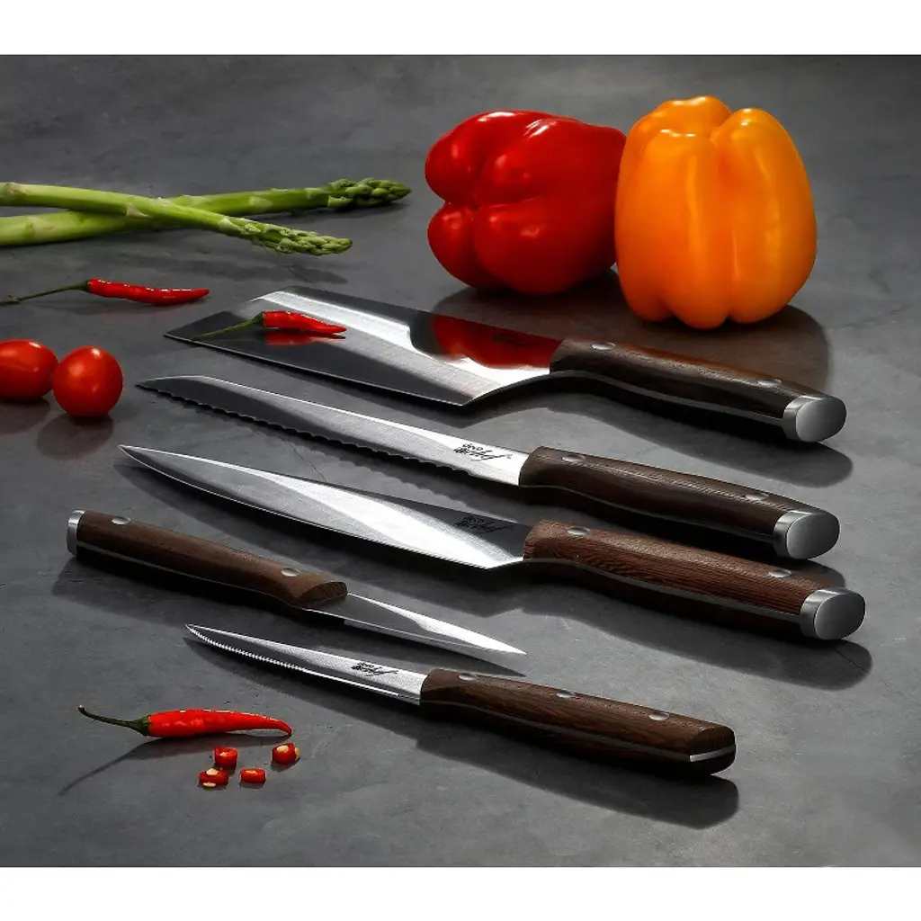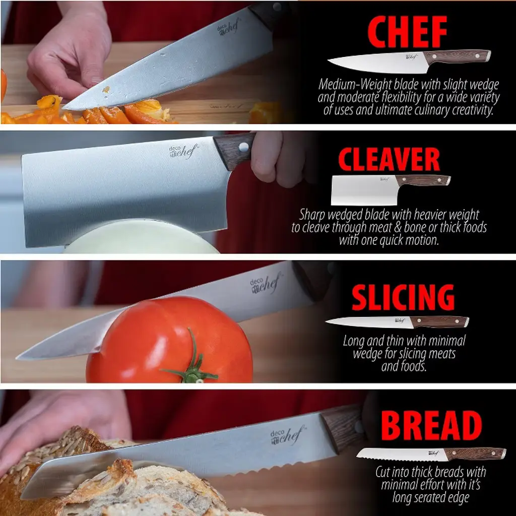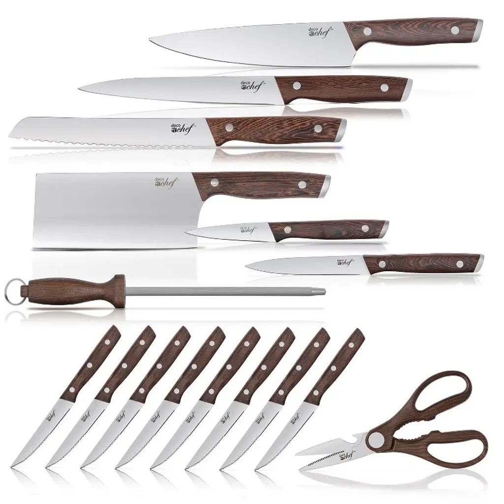 The Deco Chef 16-Piece Knife Set brings a complete cutlery package to your kitchen so you can take meal prep - and cooking enjoyment - to the next level. Each blade is comprised of high-grade 3Cr13 stainless steel that fights off rust and holds its sharp cutting edge longer. Thanks to their high strength, you can confidently tackle cutting, chopping, slicing, and dicing tasks with ease. And because they are stainless steel, hand wash cleanup is simple! Each knife handle is formed from beautiful wenge hardwood with strong 430 stainless steel endcasts. Using a full tang blade, a design that features one solid piece of metal from tip to grip, users can cut with confidence and precision. Balanced, comfortable to hold, and ergonomically shaped, these handles allow you to make cuts for longer while easing soreness and pain. Proudly display your knife set on the counter for easy access and organization. Each knife has a home in a solid acacia pinewood block using precisely sized slots that fits each type of knife. Practical, beautiful, and keeps your knives safe. Additionally, you'll get a bamboo cutting board that's more resistant to cuts and bacteria. With bolstered handles and precision blades, this quality and reliable knife set will aid your cooking efforts for years to come. However, anyone that advertises an infinite blade for life is not completely honest – that’s why we include a knife sharpener and easy to follow care guide on how to maintain the health of your knife. At Deco Chef, We Do Delicious! NOTE: To ensure lasting use of these stainless steel knives knives, do not soak overnight in water - this is bad practice for any knife as it may cause discoloration, rust, or other defects. We recommend using warm water and regular dish soap, avoiding the use of any caustic detergents. Once washed, it's best practice to dry immediately - never place a wet knife into its storage block. What's included in this kitchen knife set? 8.5" Cleaver Knife The cleaver is a butcher knife and excels at chopping through meat and hacking through bone. 8” Chef Knife A do-it-all knife that performs well at numerous tasks including slicing meat, chopping vegetables, mincing, or making larger cuts. 8" Bread Knife A thick-bladed knife used for cutting loaves of bread that excels at cutting through thick and hard crusts. 8" Slicing Knife A slicing knife is primarily used for cutting smoked or cooked meats. Long and thin, slicing knives easily cut through beef, poultry, and fish. 5" Utility Knife Utility knives are larger than paring knives but smaller than chef's knives. These are perfect for cutting larger vegetables and sandwich-sized meats that are too small for a full chef's knife. 3.5” Paring Knife Paring knives are perfect for peeling smaller fruits and vegetables. They also excel at making more detailed cuts. 4.5" Steak Knives (6) Usually offered in sets, the steak knife is commonly used at the dining table for cutting meat with its serrated blade. Acacia Pine Wood Storage Block Storage blocks help keep your cutlery organized and safe. They also look great on many counter spaces! Kitchen Shears with Wood Grain Handle More versatile than a pair of normal scissors, kitchen shears excel in food preparation with stronger handles and a notch that cuts through tough joints. Bamboo Cutting Board Harder and less porous than other hardwoods, bamboo cutting boards absorb little moisture, don't scar as easily, and also resist bacteria. Knife Sharpener with Wood Grain Handle Sometimes known as honing steel, is a rod of steel used to re-align blade edges and improve cutting capability. Blade Material: 3Cr13 Stainless Steel Handle: Wenge Hardwood with 430 Stainless Steel endcast Design: Tapered ground blades are brushed, handles are brushed Included Knives: - 6.5” Cleaver - 8” Chef Knife - 8” Bread Knife - 8” Slicing Knife - 5” Utility Knife - 3.5” Paring Knife - 4.5” Steak Knives (6) Included Accessories: - Kitchen Shears with Wood Grain Handle - Knife Sharpener with Wood Grain Handle - Wood Block, made from Acacia Pinewood Core - Bamboo Cutting Board - Knife Description and Care GuideIncludes the most commonly used cutting essentials Each blade is comprised of high-grade stainless steel Cut, chop, slice, and dice any task with ease Store each knife in an acacia pine block for storage Includes sharpening steel piece