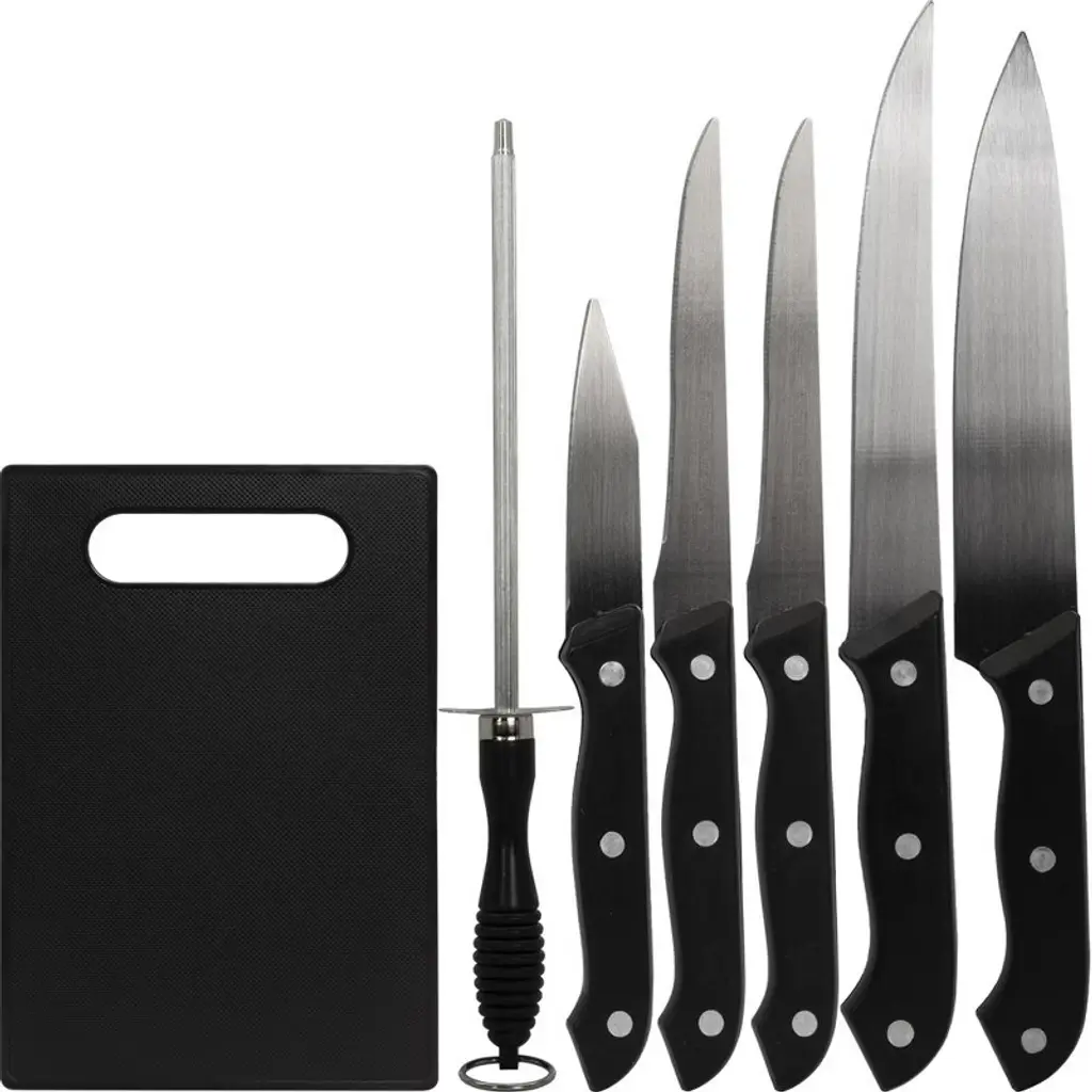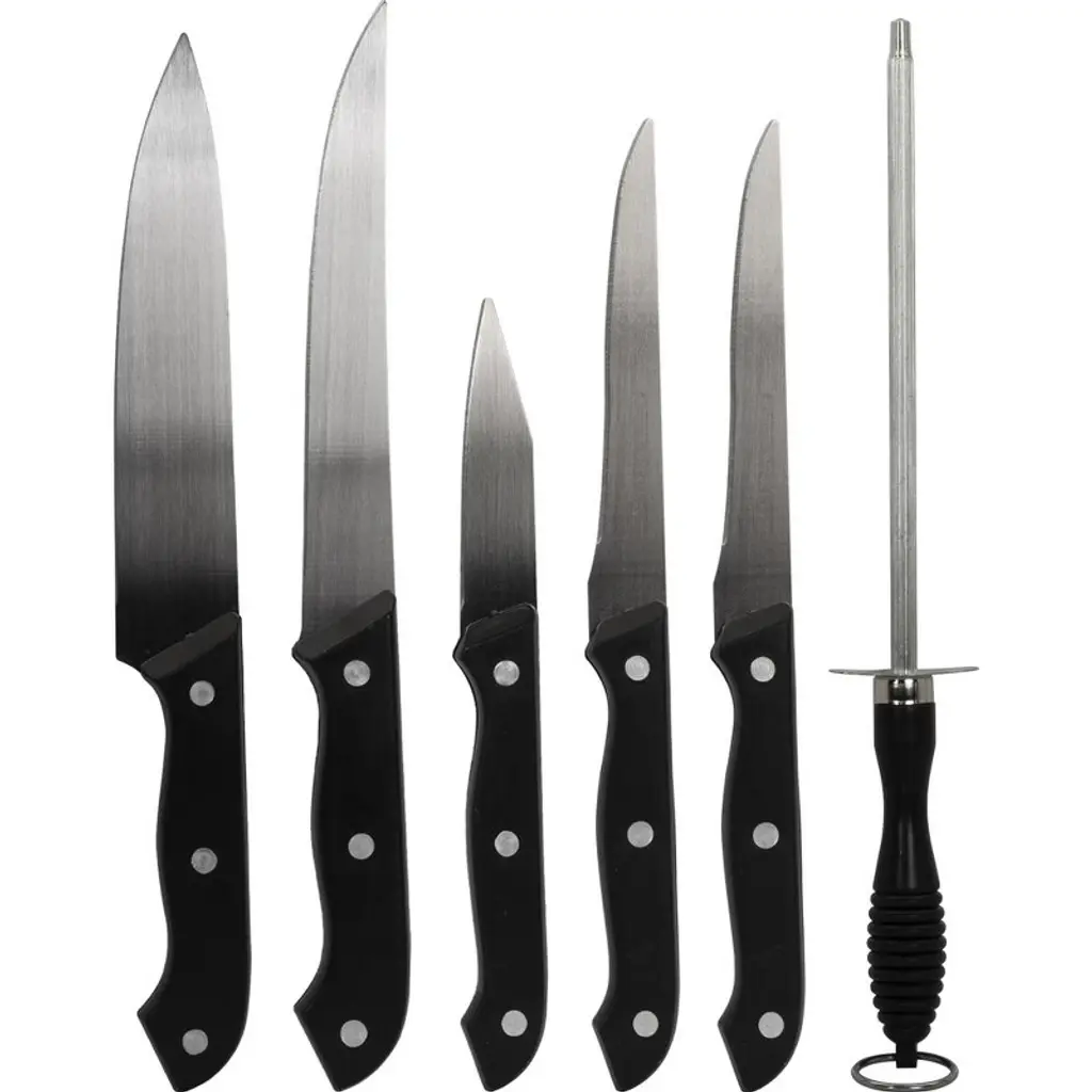A great starter knife set or perfect for adding to your collection, this 6-Piece Kitchen Knife Set will provide precision slicing and dicing for your meal prep. Including the needed basics for any kitchen, this set includes a chef knife, carving knife, paring knife, and two steak knives. Lightweight and easy to handle, these knives are for any level of cook. Each set also comes with a compact high-strength cutting board that's easy to clean, and a sharpening steel to keep properly sharp edges on all of your knives.
