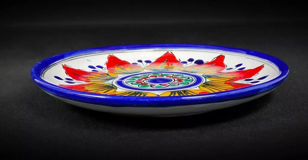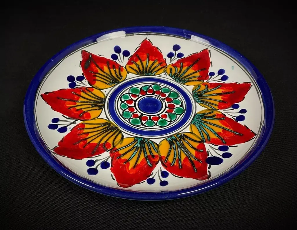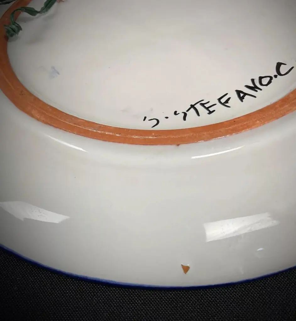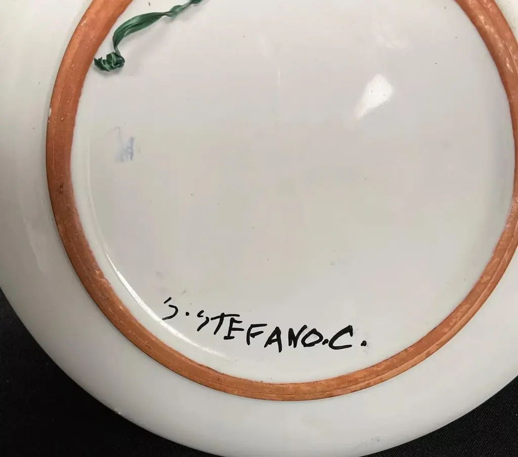 This decorative plate, signed by S. Stephano, features an elegant glazed and crackled finish with a vibrant floral design. Measuring 7.3 inches (18.5 cm) in diameter and weighing 0.76 lbs (346 g), this exquisite ceramic plate is a testament to craftsmanship and artistry. Its colorful design and unique finish make it a standout piece for collectors or as a display item.The plate showcases a floral motif in vivid shades of red, yellow, blue, and green. The central design includes a circular arrangement of flowers, framed by a blue rim that enhances the overall aesthetic. The crackled finish adds a vintage charm. While the plate is in very good overall condition, the underside shows slight damage, and there are minor chips, as noted in the photos. These small imperfections contribute to its authenticity and character.Key features:Decorative ceramic plate signed by S. StephanoDimensions: Diameter: 7.3 in (18.5 cm)Weight: 0.76 lbs (346 g)Condition: Very good, with minor damage on the underside and small chips (see photos)Material: Glazed and crackled ceramicDesign: Floral motif with vibrant colors and blue rimAuthenticity: OriginalStyle: 20th-century designOrigin: UnknownThis decorative plate is a perfect addition to any tableware collection or display. Its timeless design and exquisite craftsmanship make it an elegant and culturally rich piece to showcase in your dining room, kitchen, or as part of a curated collection.