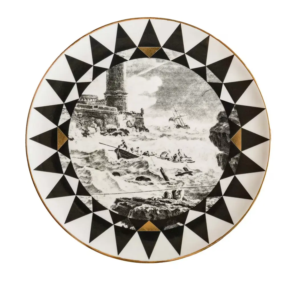Handcrafted using the ceramic mold casting method, this gorgeous ceramic plate has a distinctive Delftware allure. Showcasing a motif with a charming caravel ship navigating high seas while allegorical half-human half-dolphins swim and dive in the foreground and background. Painstakingly hand-decorated with cobalt blue oxide, along with a crystalline glaze finish, this unique objet d'art may also be displayed as a wall piece.