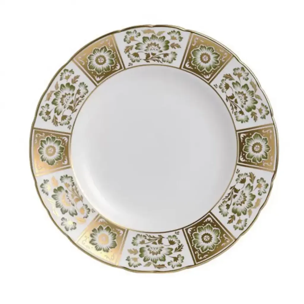 This is one of the most beautiful and lavishly gilded of our modern designs. Dramatic, yet never overstated, the tranquil green flowers and foliage are set against alternating panels of pristine white and gleaming 22 carat gold. Made in England by Royal Crown Derby. The Royal Crown Derby Porcelain Company manufactures the highest quality English fine bone china and collectibles at its headquarters in Derby, England (the English Pottery district). Although the present factory was established in 1878, the original factory was set up nearby in Nottingham Road in 1750. Queen Victoria granted permission to include the title "Royal" in the company name in 1890.