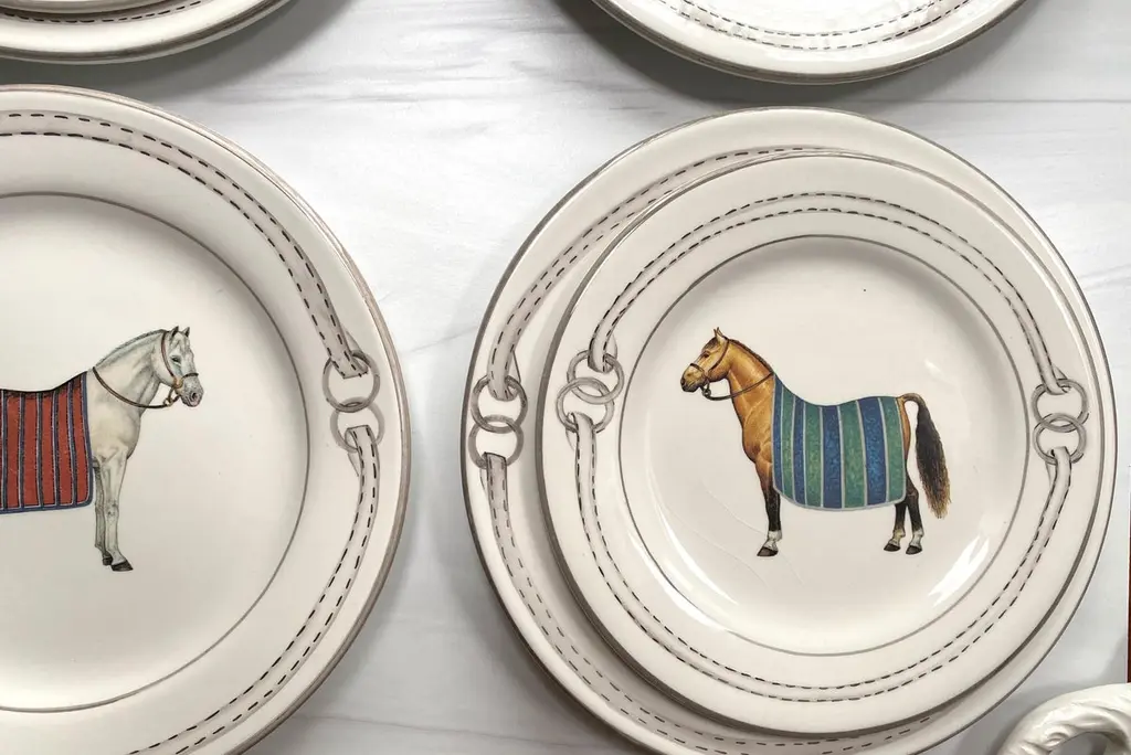 Equestrian Salad Plates, Set of 4 different blanketed horses. Made in Italy for The Mane Lion,The Mane Lion was born in 1979 in the heart of Philadelphia's fabled Main Line, offering a line of charming, hand-painted chip-and-dip serving pieces that enhanced the act of entertaining. Today, The Mane Lion continues to pursue that passion to create something that is particular and of the highest quality. We are proud that our products are crafted by master artisans in the best Italian factories, some of them generations old. Centuries of experience have enabled the Italians to produce the finest, most durable, most beautiful ceramic dishes on earth.