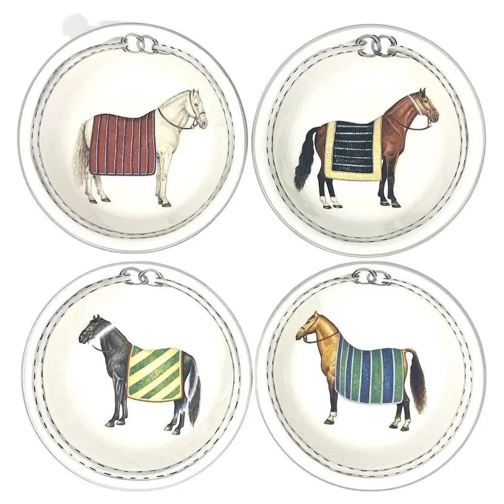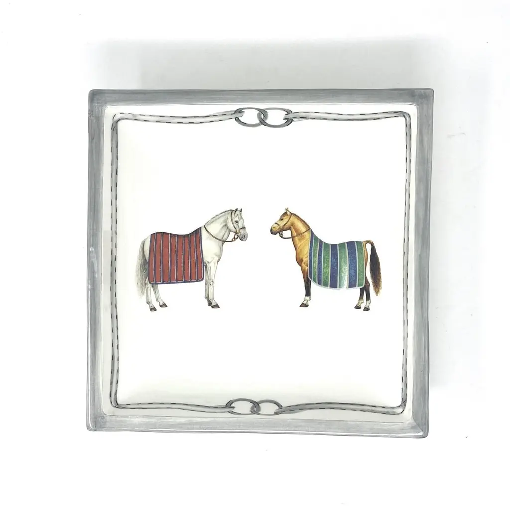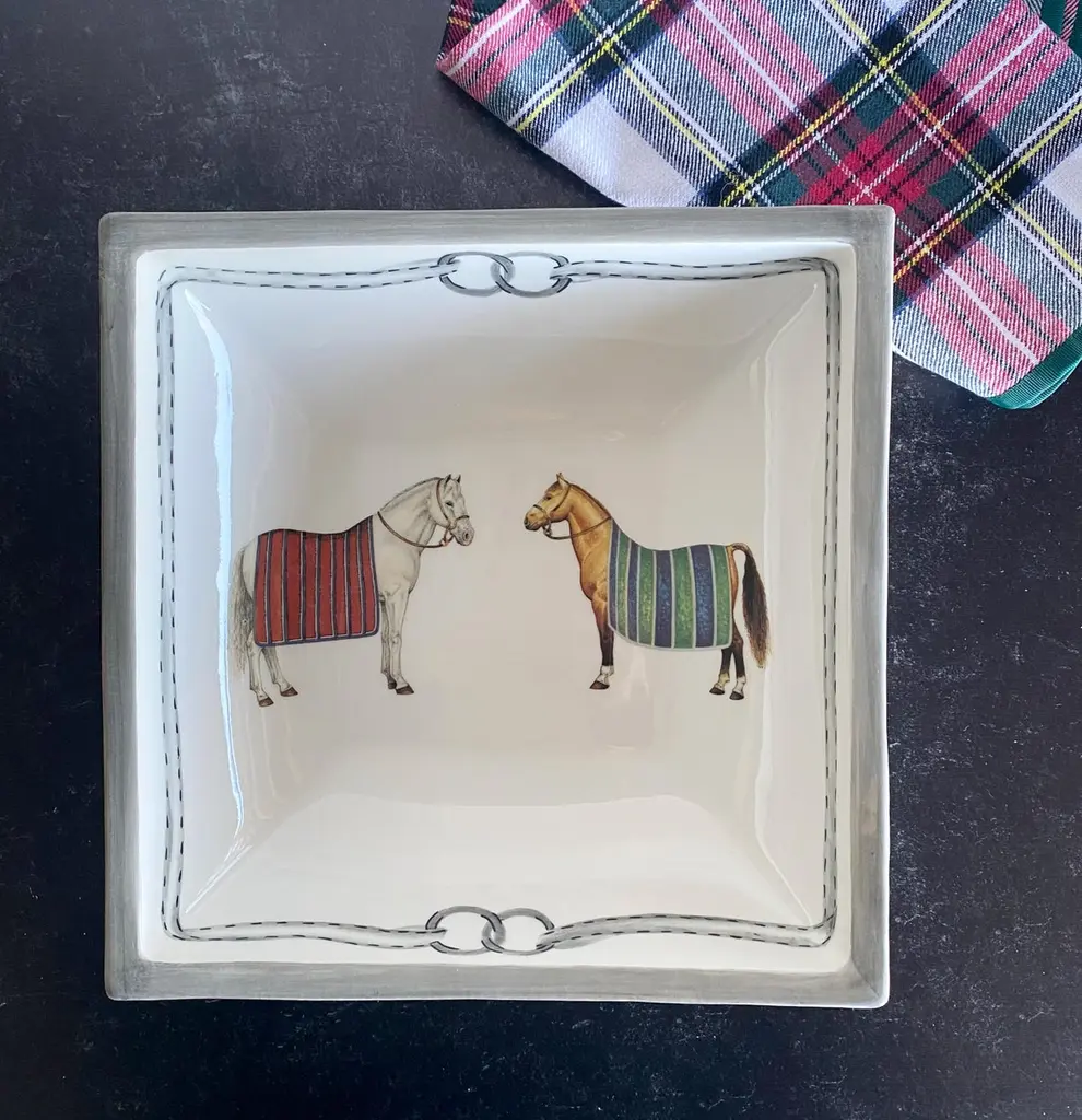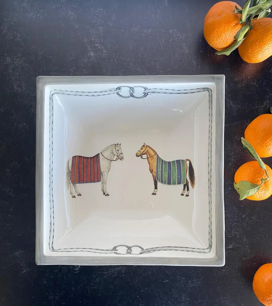 Equestrian "Devon" Serving Bowl, featuring 2 blanketed horses. Made in Italy for The Mane Lion.The Mane Lion was born in 1979 in the heart of Philadelphia's fabled Main Line, offering a line of charming, hand-painted chip-and-dip serving pieces that enhanced the act of entertaining. Today, The Mane Lion continues to pursue that passion to create something that is particular and of the highest quality. We are proud that our products are crafted by master artisans in the best Italian factories, some of them generations old. Centuries of experience have enabled the Italians to produce the finest, most durable, most beautiful ceramic dishes on earth.