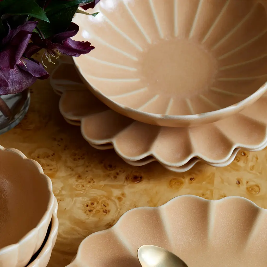 The "Dhalia" dinner set is a modern homage to the rich history of French scalloped dinnerware, famously commissioned by the Kings of France in the 18th and 19th centuries. These regal plates were originally designed to add opulence to royal banquets, their gorgeous curves inspired by the beauty of nature. The "Dhalia" collection, available in white, camel, and blue, carries forward this legacy of luxury through its beautifully scalloped edges, reinterpreting the traditional aesthetic for contemporary entertaining. Each piece has the European refinement of classic French craftsmanship, balanced with modern sophistication, making it perfect for both everyday dining and formal occasions.