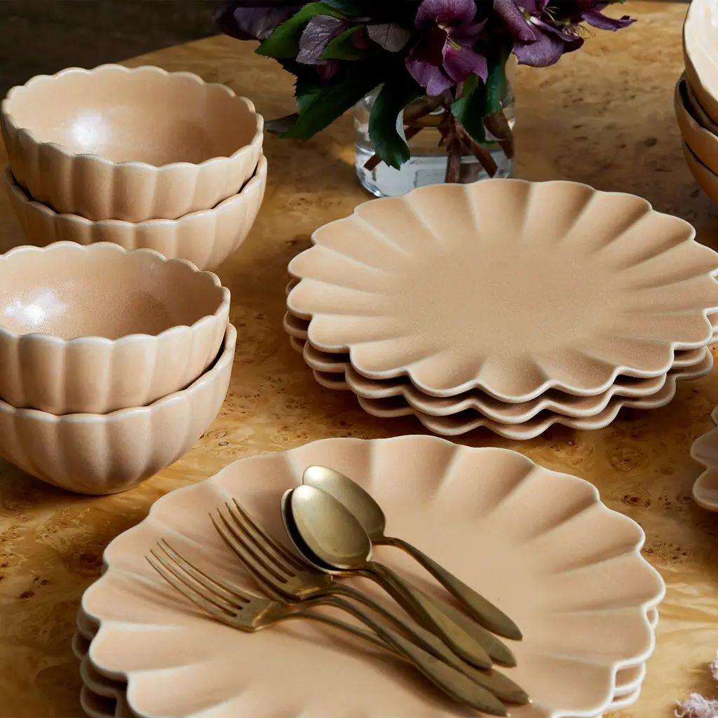The "Dhalia" dinner set is a modern homage to the rich history of French scalloped dinnerware, famously commissioned by the Kings of France in the 18th and 19th centuries. These regal plates were originally designed to add opulence to royal banquets, their gorgeous curves inspired by the beauty of nature. The "Dhalia" collection, available in white, camel, and blue, carries forward this legacy of luxury through its beautifully scalloped edges, reinterpreting the traditional aesthetic for contemporary entertaining. Each piece has the European refinement of classic French craftsmanship, balanced with modern sophistication, making it perfect for both everyday dining and formal occasions.