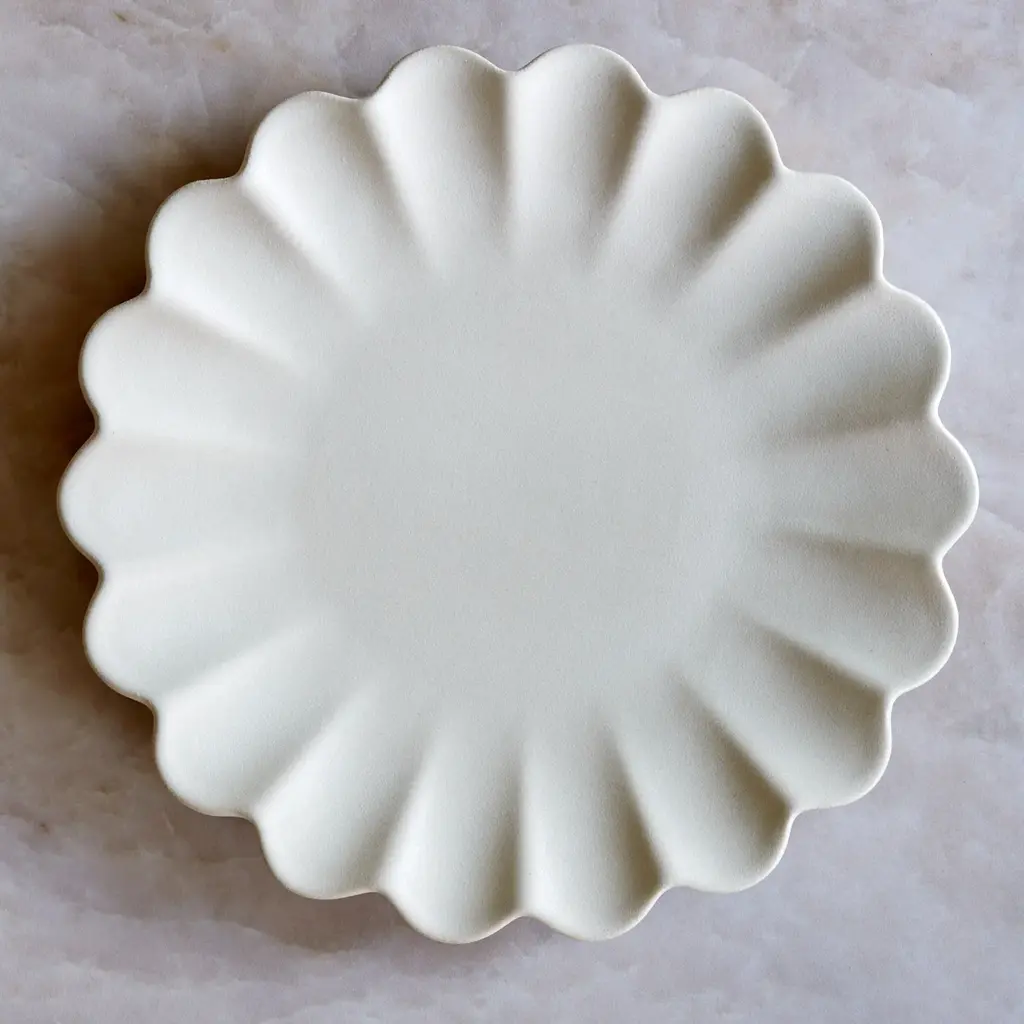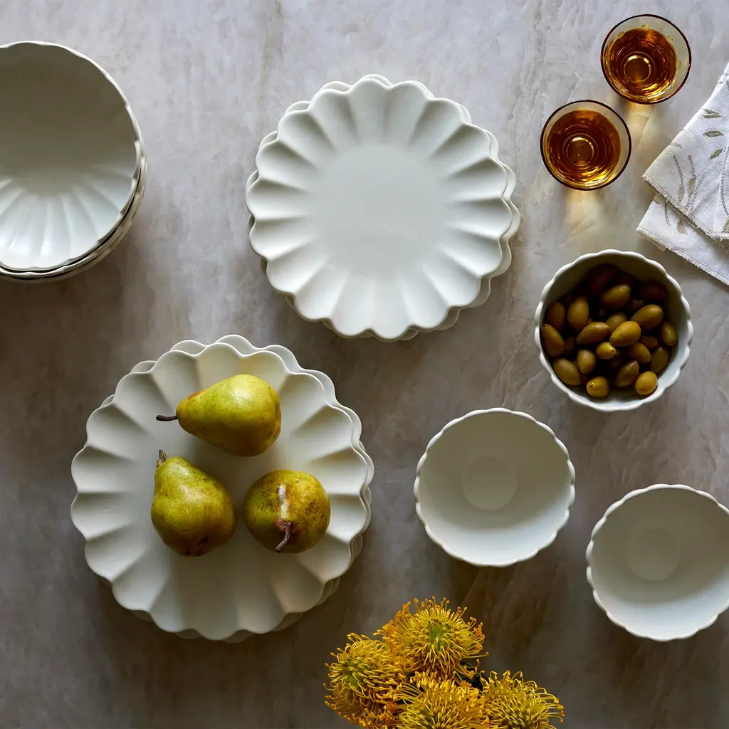 The "Dhalia" dinner set is a modern homage to the rich history of French scalloped dinnerware, famously commissioned by the Kings of France in the 18th and 19th centuries. These regal plates were originally designed to add opulence to royal banquets, their gorgeous curves inspired by the beauty of nature. The "Dhalia" collection, available in white, camel, and blue, carries forward this legacy of luxury through its beautifully scalloped edges, reinterpreting the traditional aesthetic for contemporary entertaining. Each piece has the European refinement of classic French craftsmanship, balanced with modern sophistication, making it perfect for both everyday dining and formal occasions.