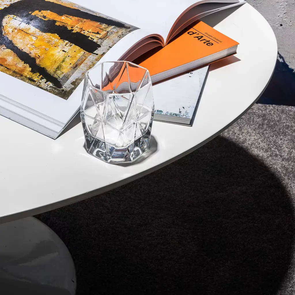 Designed by Karim Rashid, this opulent glass was made by hand of crystal in a delicately tinted shade. By combining a modern aesthetic and a tradition of exquisite craftsmanship, Purho created the ultimate crystal glass. Its multifaceted surface evokes the richly articulated shape of diamonds and will add elegance and sophistication to both a modern and a classic home.