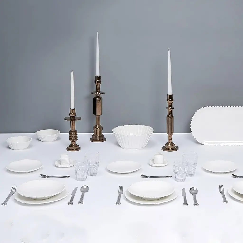 This set of three porcelain dinner plates is a part of the Machine Collection, a creative collaboration between Diesel and Seletti. Inspired by the forms of industrial gears and mechanical elements, each plate features subtle ridged detailing that enhances both aesthetics and usability. Designed to complement other pieces in the collection—such as bowls, jars, and coffee cups—these plates bring a bold, industrial character to any table setting.