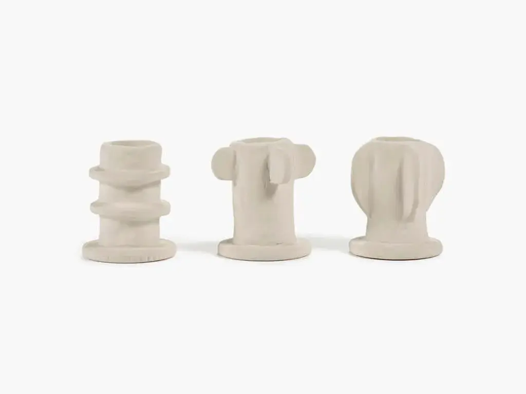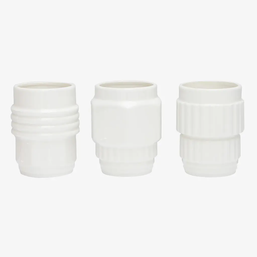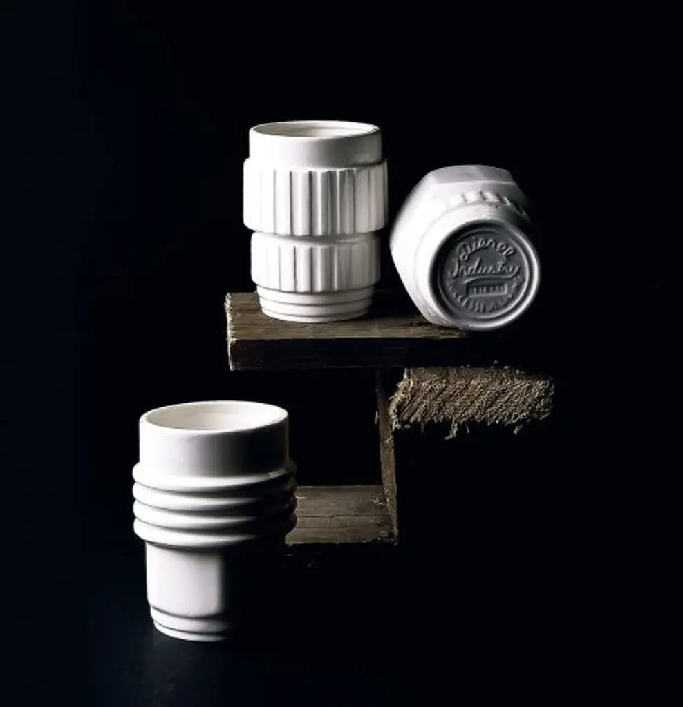 The Machine Mug Collection is a set of three mugs for coffee or tea. Designed by the esteemed Italian brands Diesel Living and Seletti, each mug has a distinct industrial-inspired grip. The no-handle drinkware is simply made of porcelain and glazed with a white, food-safe finish. The easy-to-clean design is also safe to be run through the dishwasher.