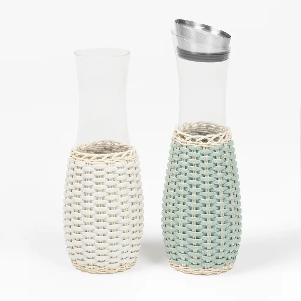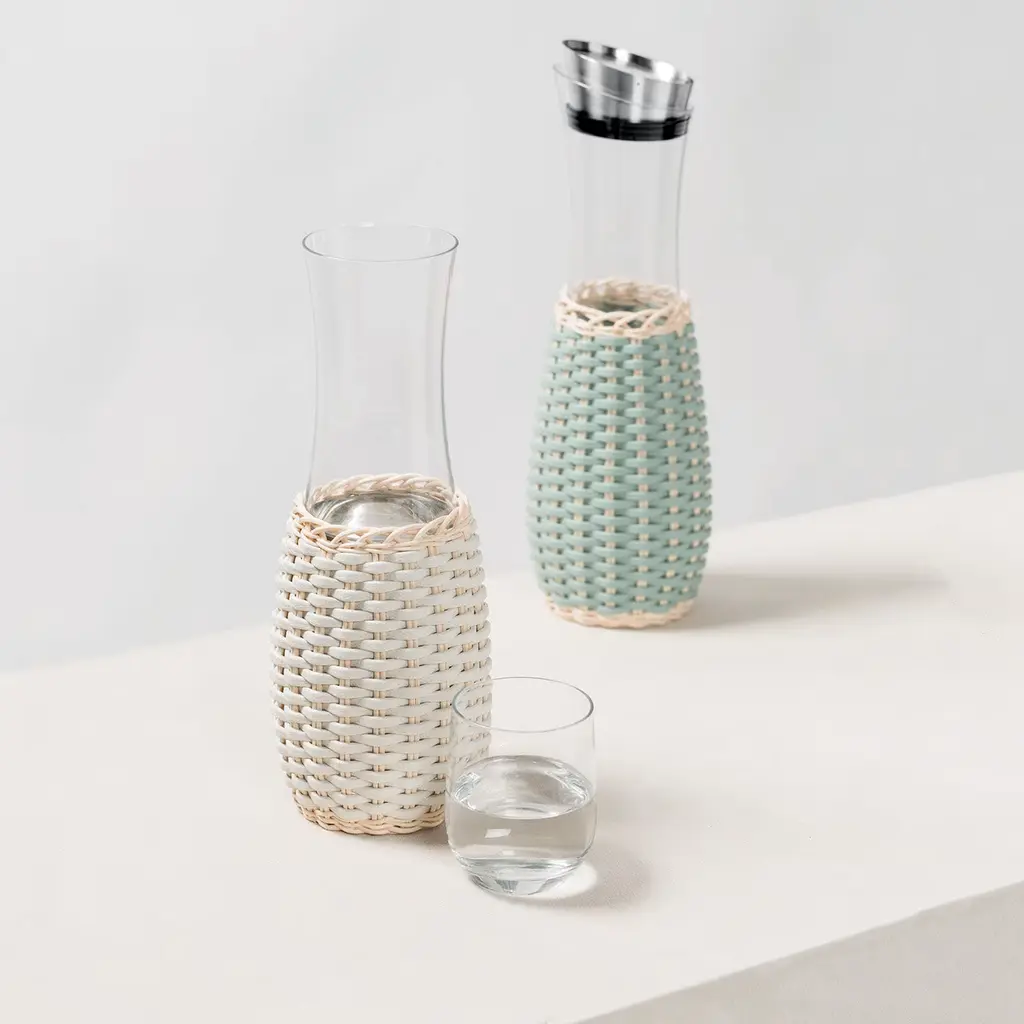 An elegant accent piece that will elevate the allure of any table setting, this exquisite carafe boasts a harmonious combination of refined materials, textures, and hues. Distinguished by a tapered and sinuous silhouette fashioned of clear crystal, it is enriched with a stainless steel practical pourer and a stylish upholstery made of green Napa leather and natural rattan. A version with a stainless steel swing top is available upon request.
