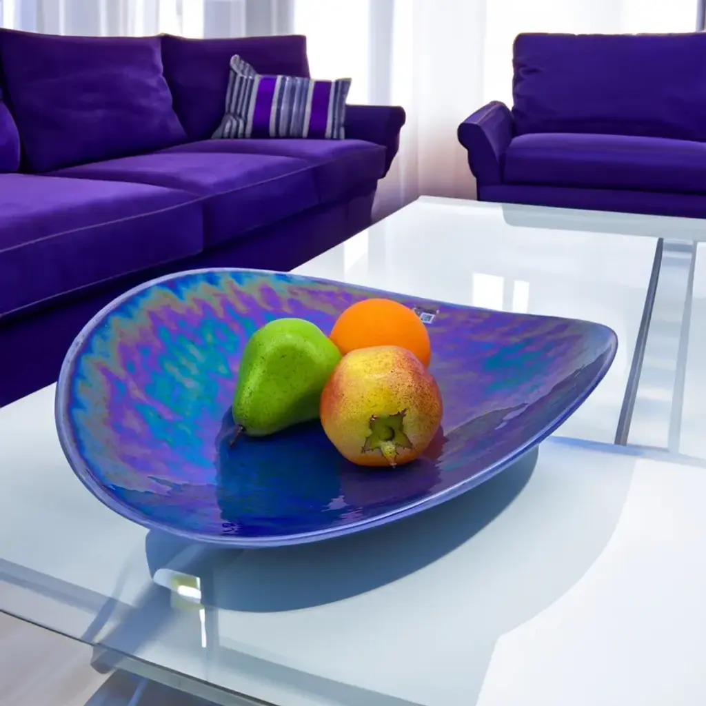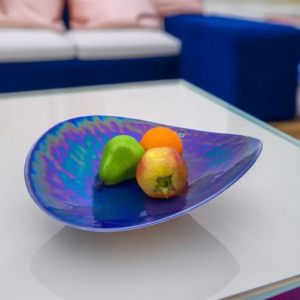 DINDINI is a blue decorative Murano glass plate entirely made in Venice. Amaze your guests with this masterpiece of Made in Italy craftsmanship.Whether you're looking for an elegant addition to decorate your dining room or an original Venetian glass gift idea to amaze someone, these decorative fruit plates in Venetian glass are the perfect solution! Find the perfect match for your home and create a truly unique and original interior design. All our products are handcrafted and of the highest production quality. Non-substantial variations in shape, size, color, and/or minor imperfections are inevitable and are typical of manual glasswork, highlighting the artisanal craftsmanship.