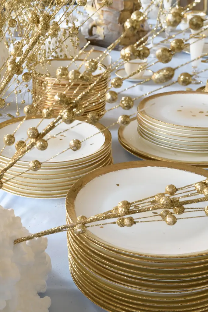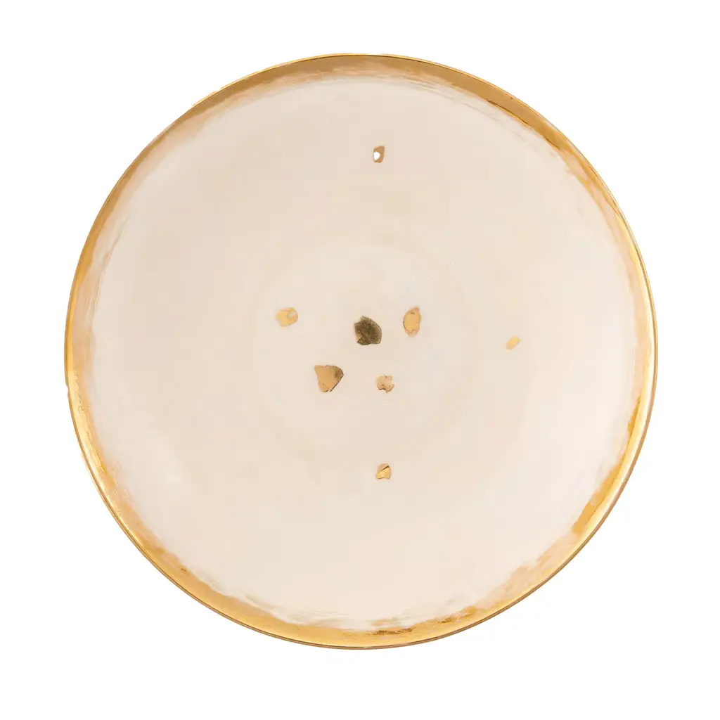 Michelangelo Bianco is an elegant tableware ideally suited for formal occasions and intimate events. Plates are decorated with a light beige enamel at the center. They feature a new, exclusive golden edge with a precious, slightly rough feeling at the touch. The dessert and soup plates are also available in full beige enamel decoration.Ever close to nature, Coralla Maiuri enjoys her new creation and describes its colors as going from gold for the hot summer sun to caramel for parched grass to white for the cold winter Each Coralla Maiuri product is entirely hand decorated. Each is a work of art. While ensuring consistency, they are never identical. Slight variations of decor and color tones from one to another are not only normal, but to be expected as a sign of their uniqueness.Avoid routine dishwashing and favour non-aggressive soap and delicate washing.Due to the presence of real 24-karat gold, this item is not suitable for microwaveHand Painted PorcelainHand Painted 24 k GoldMade in Italy.