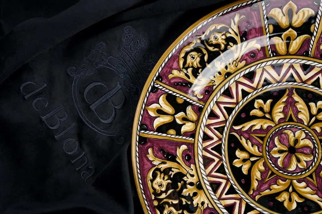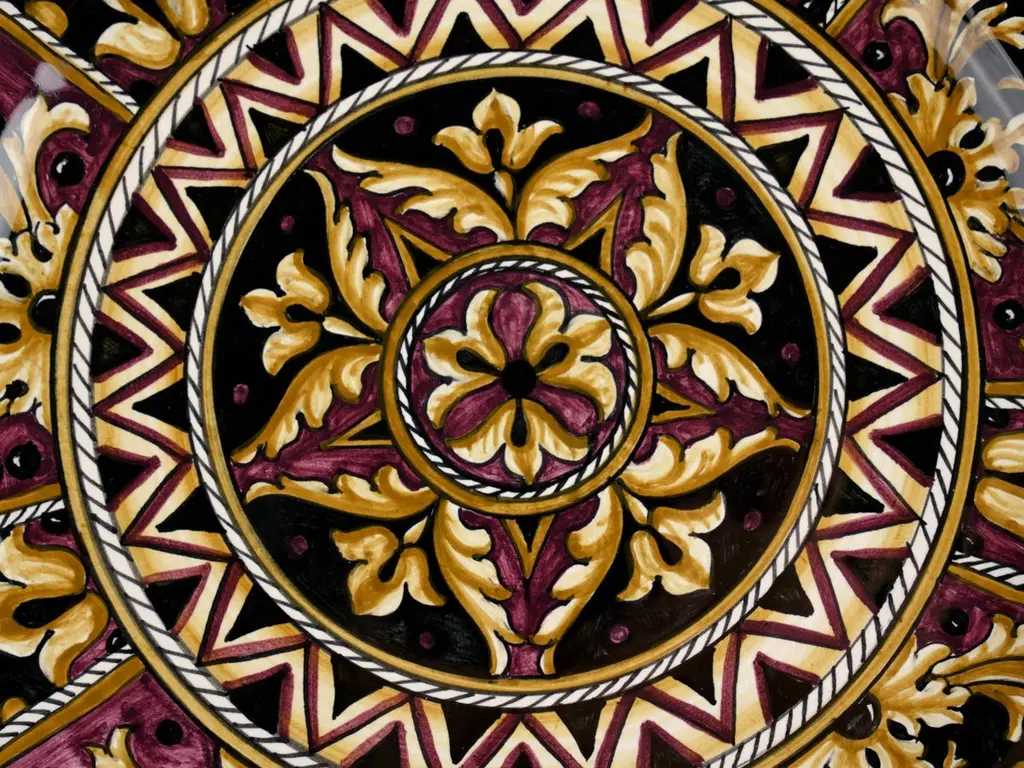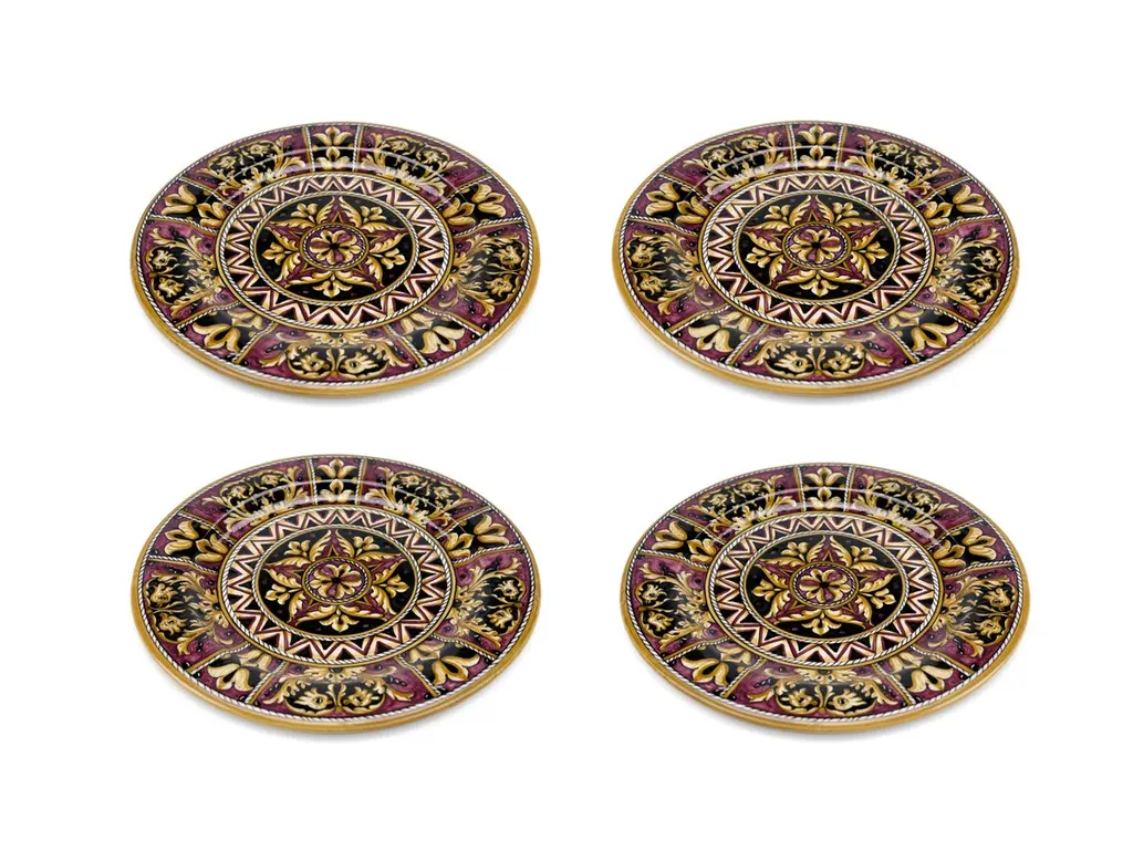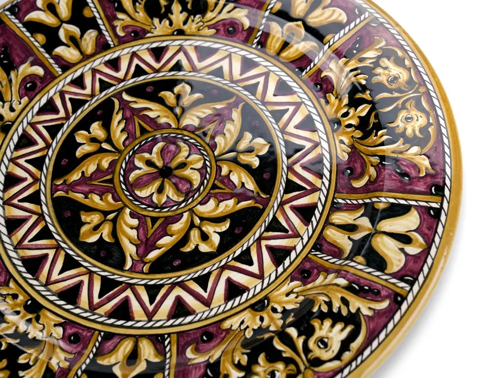 This luxurious set of four plates, in majolica painted in polychrome, reinterprets the "VARIO RICCO" decoration of the sixteenth century in Deruta: our plates are handmade and hand-painted in Italy following the original Renaissance painting technique, unchanged over time, which we observe to the letter. These majolica masterpieces can be exposed as elegant charger platters and used to decorate your table. The brim with a radial structure is divided by ten bands with shoots of leaves and metamorphic figures that are repeated regularly, arranged according to a criterion of specular symmetry. The decorative apparatus of the cable consists of an elegant ornament characterized by a central motif of floral inspiration in the shape of a star. The lively contrast of black, golden yellow and dark purple colors gives the product a whimsical and refined look.Further possibility to order a set of 6 or 12 charger plates.D: 32 cm (12.6 in)Colors: black, golden yellow, purple.Visit our storefront to discover the whole deBlona collection.The beauty of a deBlona majolica is determined by the ancient process, unchanged over time and handmade, which we observe to the letter in the creation of our artworks: painting ceramics is a very complex, fascinating and insidious art, but it is precisely the human and imperfect sign that makes every piece so characteristic and totally unique. deBlona's essence is represented by the interpretation of the color and by an unrepeatable taste, with which we want to give new chromatic emotions. Majolica accompanies the history of mankind, telling its existence for centuries: here, in our Atelier, we want to keep on narrating our time.