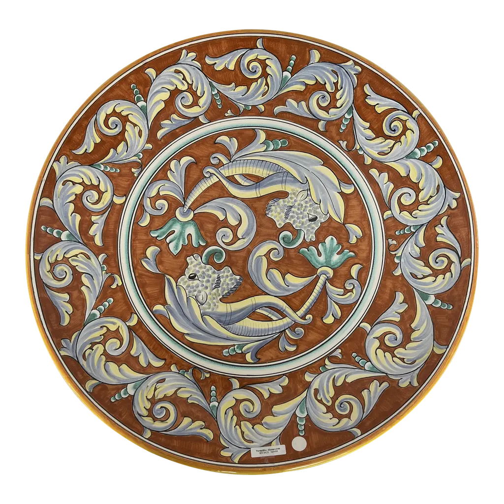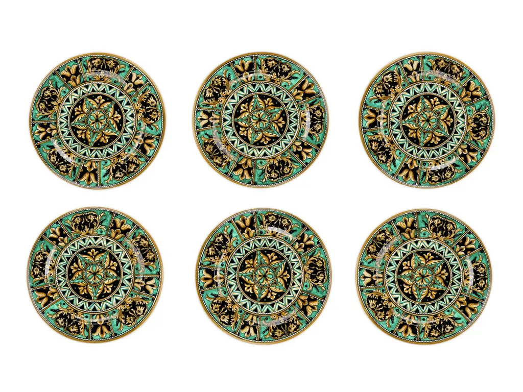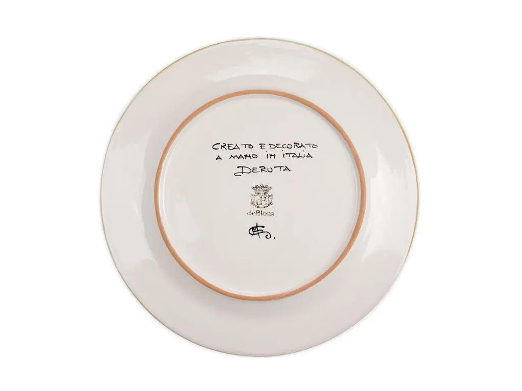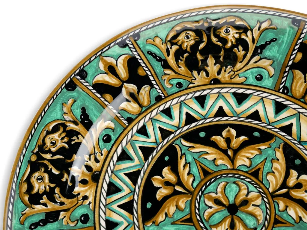 This exclusive set of six plates, in majolica painted in polychrome, reinterprets the "VARIO RICCO" decoration of the sixteenth century in Deruta: our plates are handmade and hand-painted in Italy following the original Renaissance painting technique, unchanged over time, which we observe to the letter. These majolica masterpieces can be exposed as elegant charger platters and used to decorate your table. The brim with a radial structure is divided by ten bands with shoots of leaves and metamorphic figures that are repeated regularly, arranged according to a criterion of specular symmetry. The decorative apparatus of the cable consists of an elegant ornament characterized by a central motif of floral inspiration in the shape of a star. The lively contrast of black, golden yellow and aquamarine colors gives the product a whimsical and refined look.Further possibility to order a set of 4 or 12 charger plates.D: 32 cm (12.6 in)Colors: black, golden yellow, aquamarine.Visit our storefront to discover the whole deBlona collection.The beauty of a deBlona majolica is determined by the ancient process, unchanged over time and handmade, which we observe to the letter in the creation of our artworks: painting ceramics is a very complex, fascinating and insidious art, but it is precisely the human and imperfect sign that makes every piece so characteristic and totally unique.deBlona's essence is represented by the interpretation of the color and by an unrepeatable taste, with which we want to give new chromatic emotions.Majolica accompanies the history of mankind, telling its existence for centuries: here, in our Atelier, we want to keep on narrating our time.