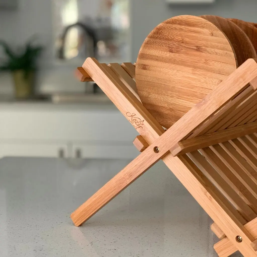 Dry or store your dishes with ease with the Kozy Kitchen dish rack!Kozy Kitchen rack is both stylish and functional on your counter. This bamboo dish rack is ideal for air drying or storing your dishes. Cups, glasses and mugs can be rested on the angled shelves, while slots allow for secure holding of many dishes. It folds flat for easy storage when not in use. The bamboo rack can be hand-washed for quick cleanup.Size: 18" (L) x 13" (W) x 10" (H)