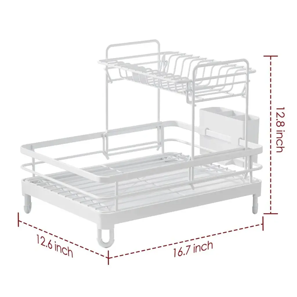 With dimensions of 16.7"L x 12.8"W x 12.6"H, this two-tier dish drainer offers generous storage space while maintaining a compact footprint. Its efficient design comfortably accommodates tableware for 3-6 people, making it ideal for daily use without overcrowding your kitchen counter. Designed for optimal organization, this 3-in-1 drying rack features dedicated zones for different kitchen items. Plates fit neatly on the top tier, while bowls and pots can be placed on the lower level. The included removable cutlery holder keeps utensils and knives neatly separated and easily accessible. Built for durability, the rack is constructed from heavy-duty, rust-resistant materials to ensure long-lasting performance. The sturdy L-shaped frame and anti-slip feet provide stability, preventing movement even when fully loaded with wet dishes. Assembly is quick and hassle-free—no tools required. The straightforward instructions guide you through the simple setup process. When it's time for cleaning, the rack easily disassembles, allowing you to rinse each component under water and air dry for maintenance-free upkeep. The detachable design not only simplifies cleaning but also promotes better hygiene. Each removable part can be thoroughly washed, ensuring your tableware stays protected and your dish rack remains fresh and sanitary.