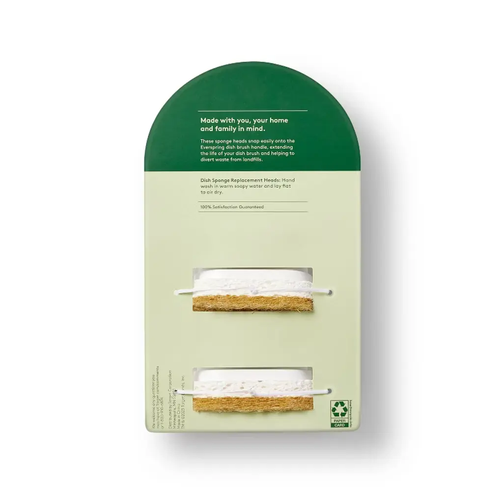 Extend the life of your dish brush with this 2-Pack of Dish Sponge Replacement Heads from Everspring™. These replacement heads snap easily onto the Everspring dish brush handle to replace the old one, and they're great for everyday dishwashing as well as removing baked-on food and grease. To clean the replacement heads, simply hand wash and lay flat to air dry.Everspring™: Down-to-earth solutions that are up to Earth's standards.