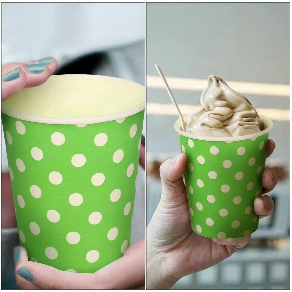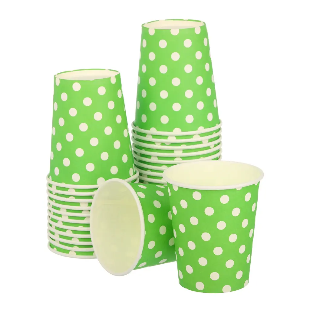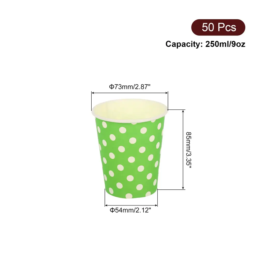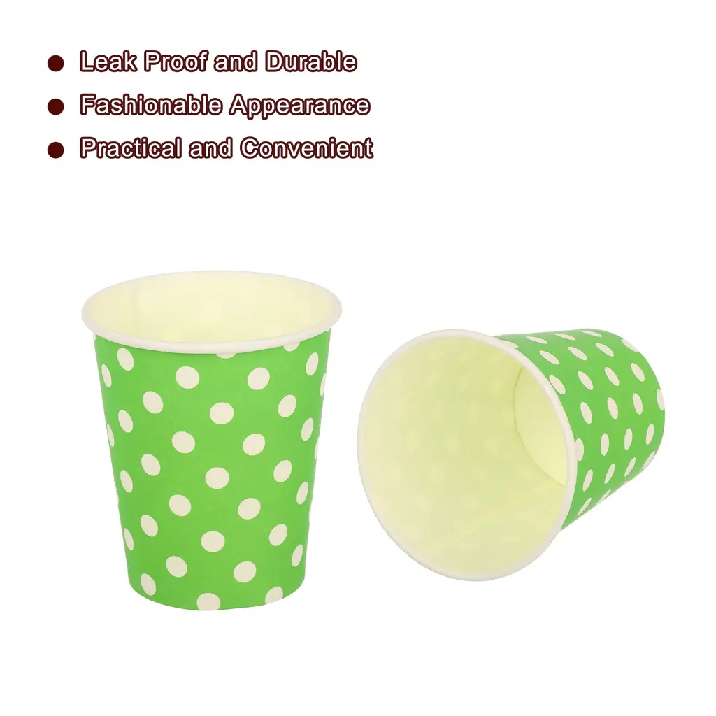 [Leakproof and Durable]: The sturdy paper cups are made of thickened paper, which is sturdy and durable and not easy to tear, and can be used by guests throughout the party.[Fashionable Appearance]: The cup body color is brighter and more lively than the traditional white or primary color,which can not only be used for drinking but also as decoration, adding taste to any event, easily meeting your daily and party use needs, and can be matched with all your plates, cutlery and other tableware.[Practical and Convenient]: The edge of the paper cup is rolled, comfortable to drink, and can be used for any hot or cold drinks, without worrying about hurting your hands, because these cups have excellent heat insulation properties.[Wide Application]: Suitable for home or commercial use, suitable for Christmas, Halloween, birthday parties and tea parties, so that you can free up time to entertain guests without worrying about washing dishes.Specification:Capacity: 250mlHeight: 85mm/3.35"Bottom: 54mm/2.12"Diameter: 73mm/2.87"Material: PaperColor: Green polka dotPackage Contents: 50 pack x Paper cups