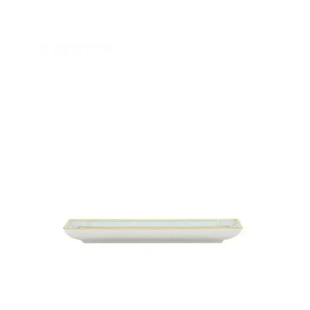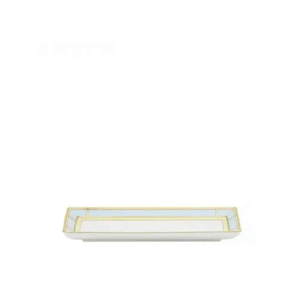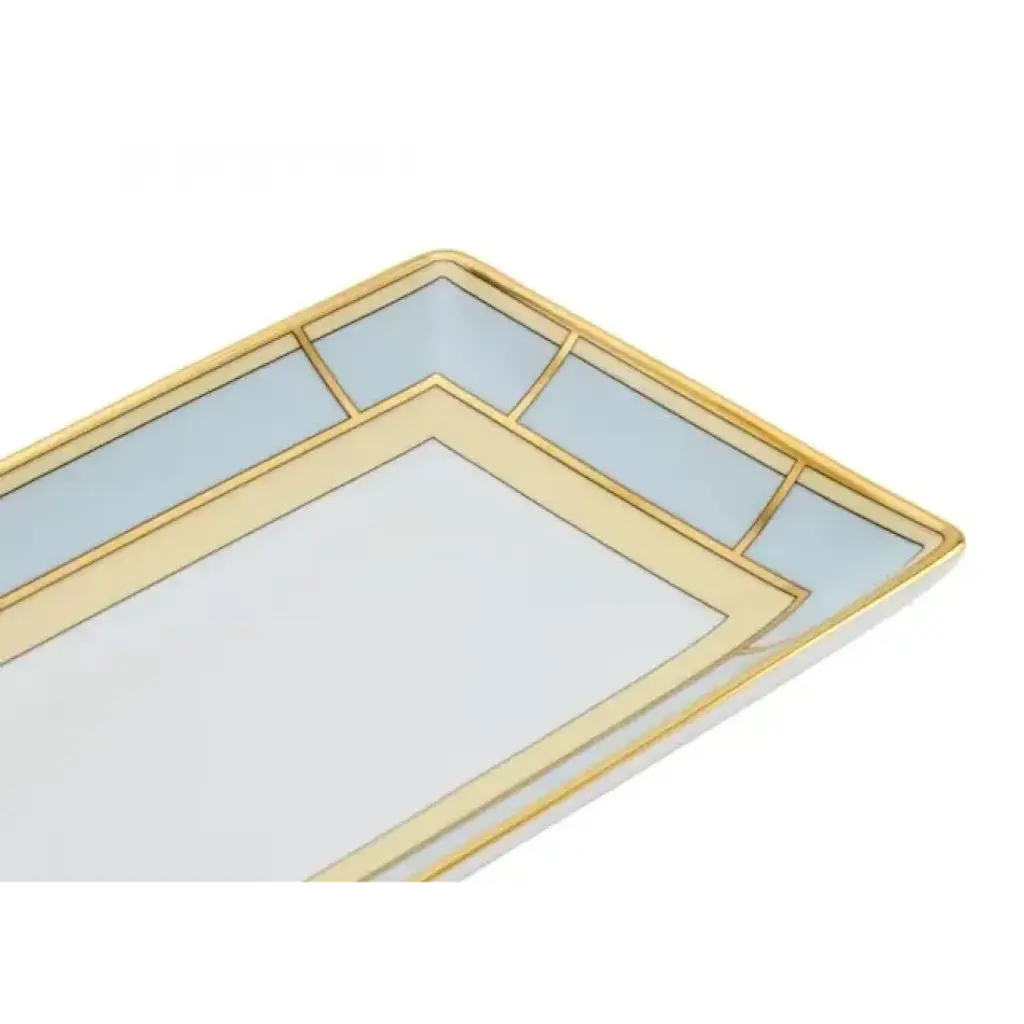 Rectangular porcelain change tray with Celeste and gold decoration. New Diva collection. It is characterized by a sky-blue decoration and enhanced by distinctive gold threading. Versatile and dynamic, it is designed to be both a home décor accessory and a tray for serving hors d'oeuvres with an aperitif or mini desserts and chocolates. It comes wrapped in an exclusive luxury box that makes it a perfect gift. Diva is a collection that combines the allure of a bygone era with a fresh perspective on contemporary design. Available in an assortment of tableware and giftware, it comes in four pastel colors that can be mixed & matched in arrangements that suit your personal style and in a way that is always original.