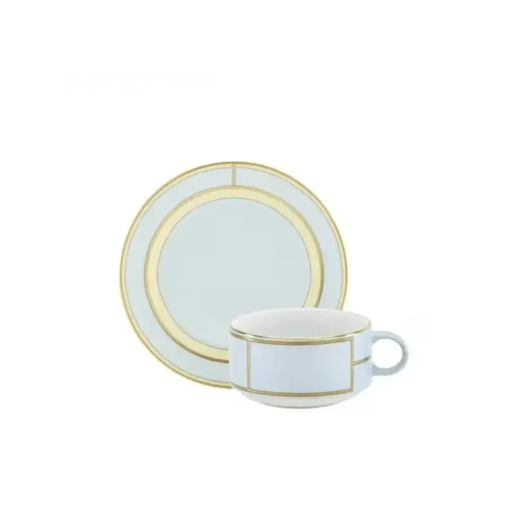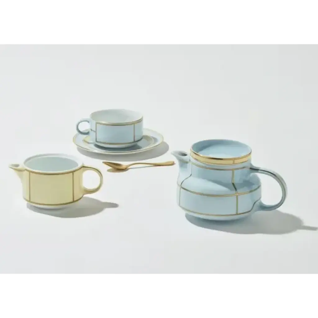 Set of two porcelain tea cups with Celeste and gold decoration. New Diva collection. They feature a sophisticated sky-blue decoration and exquisite gold threading, and they complement the set alongside saucers, a teapot, sugar bowl and milk pitcher, to bring the atmosphere of the 1950s to moments of relaxation. Elegant and vibrant with a vintage edge, Diva combines the glamour of a bygone era with contemporary design. It is available in an assortment of tableware in four pastel tones. Each piece, drawn from Giovanni Gariboldi's iconic Colonna collection, is designed to be stacked in symmetrical compositions that can be neatly stored in small spaces.