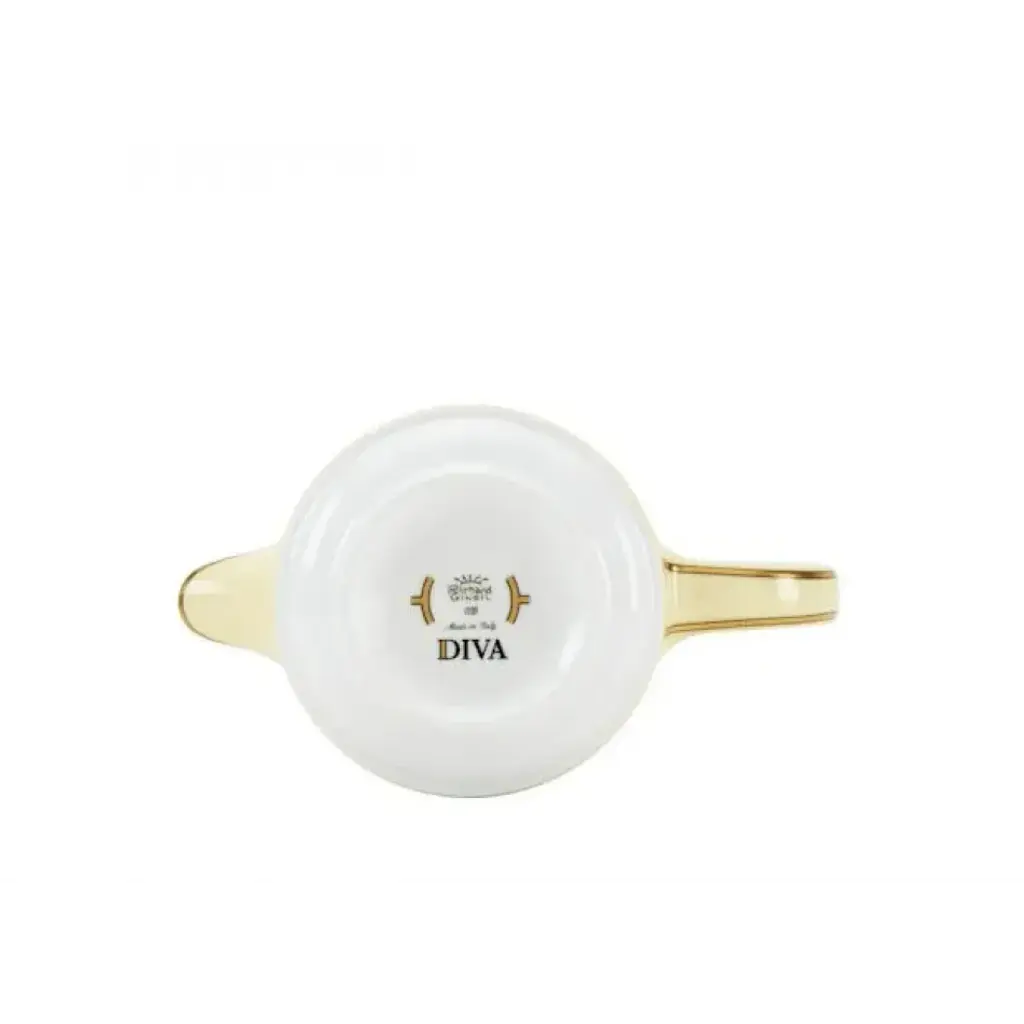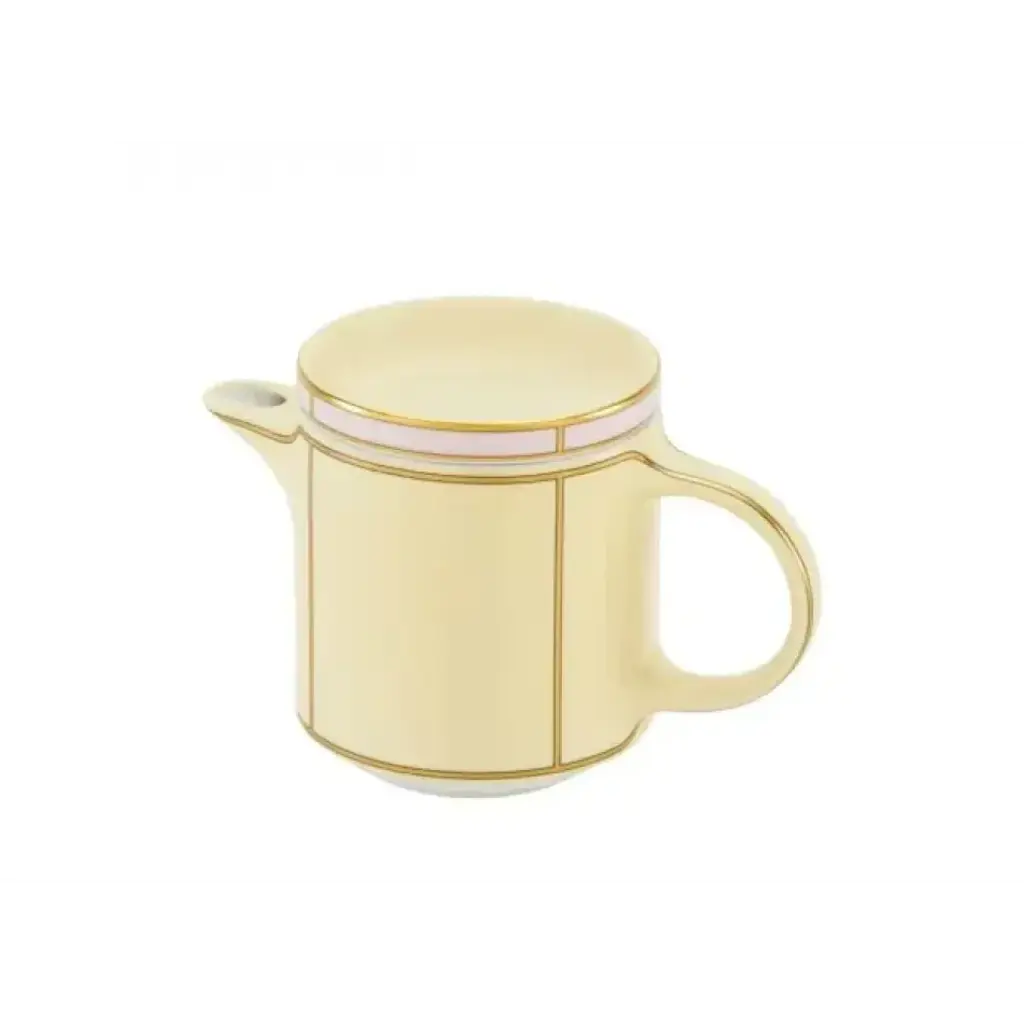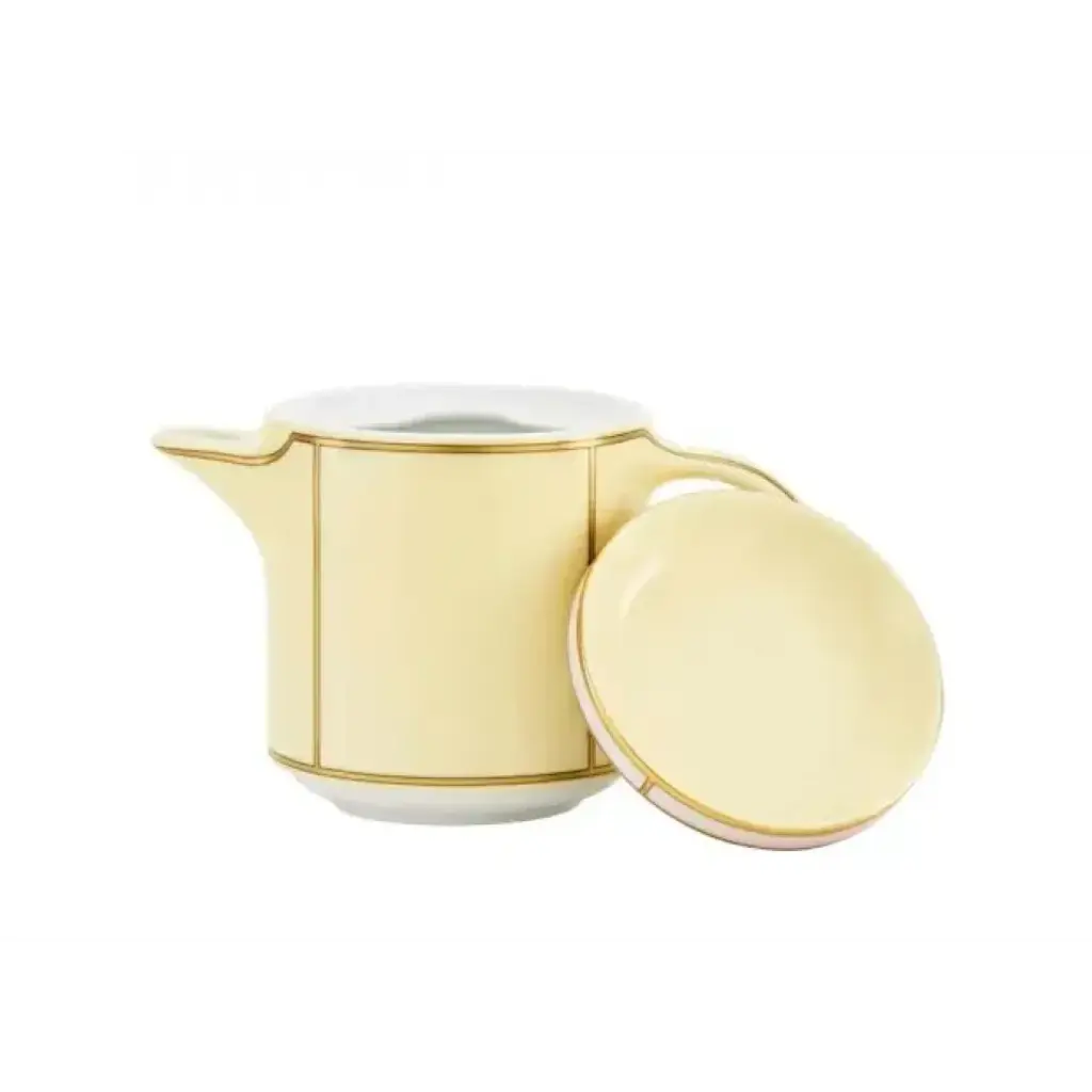 Porcelain coffeepot with Giallo and gold decoration. New Diva collection. It features a yellow decorative pattern on fine porcelain enriched with gold threading. The lid features a contrasting pastel pink motif. It complements the coffee set from the same line, alongside the sugar bowl, milk pitcher, cups and plates, and all elements of the service are available in four colors to be mixed & matched on the table. Diva enhances Ginori 1735's range with a vibrant and eclectic selection of tableware and giftware. It is drawn from the Colonna collection, which was awarded the prestigious Compasso D'Oro prize in 1954 and celebrates Giovanni Gariboldi, a designer and the Artistic Director of the factory in the 1950s, who brought innovation to the very concept of design when he re-envisioned the art of porcelain through a modern lens.