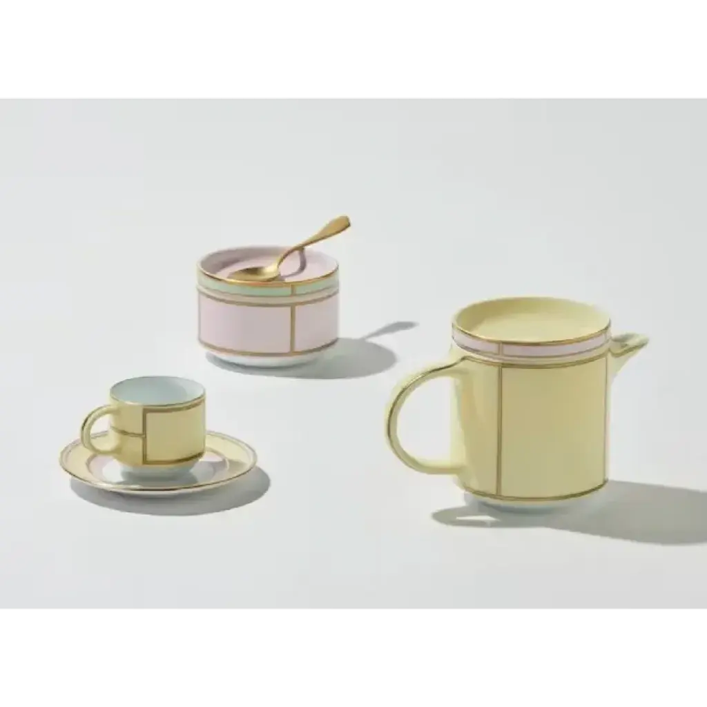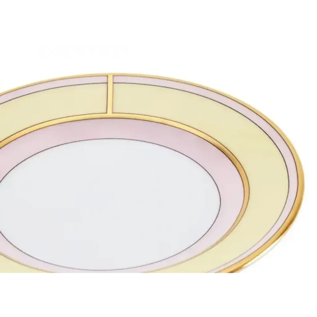 Set of two porcelain coffee saucers with Giallo and gold decoration. New Diva collection. Characterized by luminous gold threading, a yellow decorative motif and Giovanni Gariboldi's iconic Colonna shape born in the 1950s, they complement the coffee service of the same line alongside coordinating mugs, coffeepot, sugar bowl and milk pitcher. Mix & match the four available pastel colors to add a personal touch to an always distinctive set. Diva is a collection of porcelain tableware and giftware that reflects the vibrance of mid-century Italy and is an homage to the Cinema divas of the era. It is distinguished by the clean lines and functional design that make it the star of any setting.
