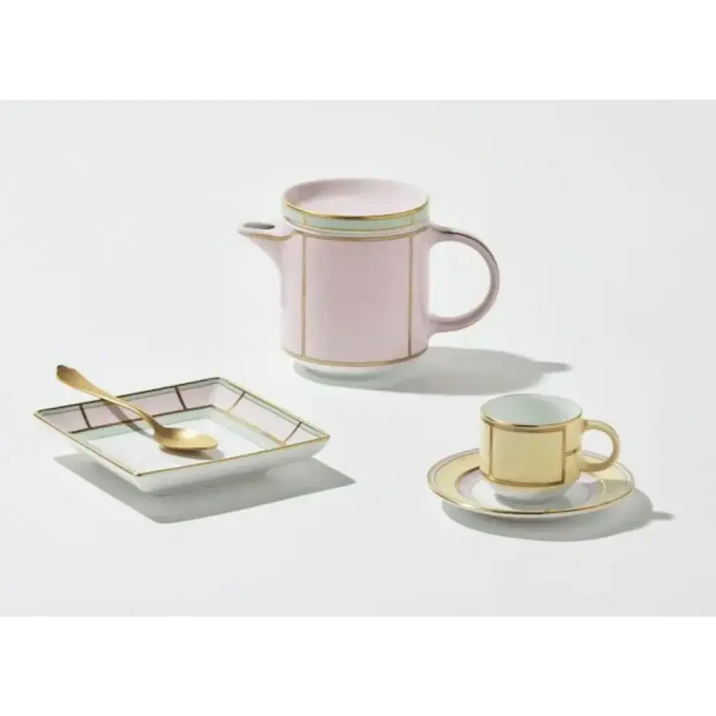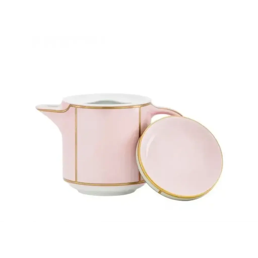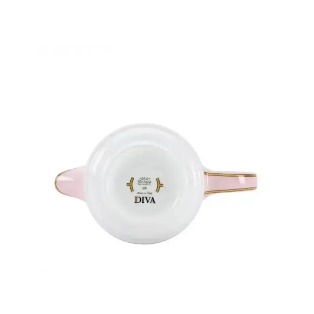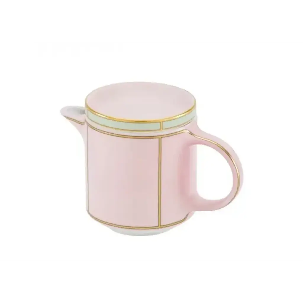 Porcelain coffeepot with Rosa and gold decoration. New Diva collection. It is characterized by a pink decoration on fine porcelain and a lid featuring a motif in contrasting light green. Delicate gold threading accentuates and illuminates the design. It complements the coffee set of the same line, alongside the sugar bowl, milk pitcher, cups and plates, all of which are designed to be combined in arrangements that include the four available pastel hues. Diva enriches the Ginori 1735 range with a vibrant and eclectic selection of tableware and giftware inspired by the dreamlike atmosphere of 1950s cinema and the divas who were its glittering stars. It re-envisions the Colonna collection, designed by Giovanni Gariboldi and released in the mid-1950s, through a contemporary lens. Each element is designed to be stacked so that the service can be easily tucked away into small spaces.