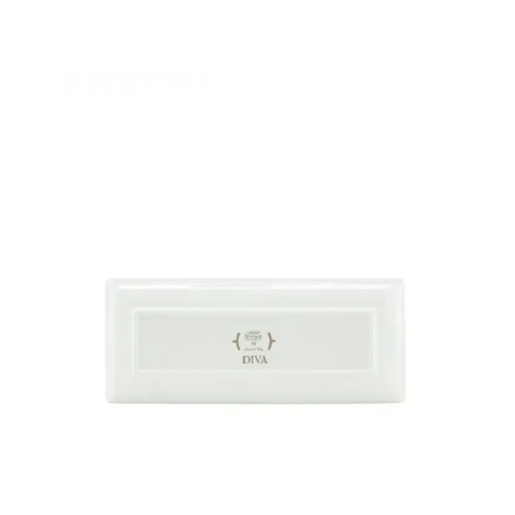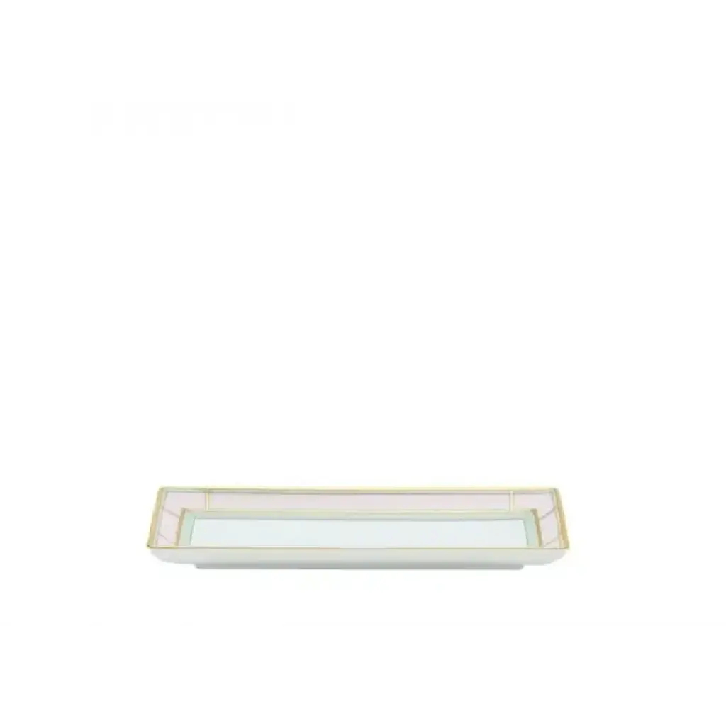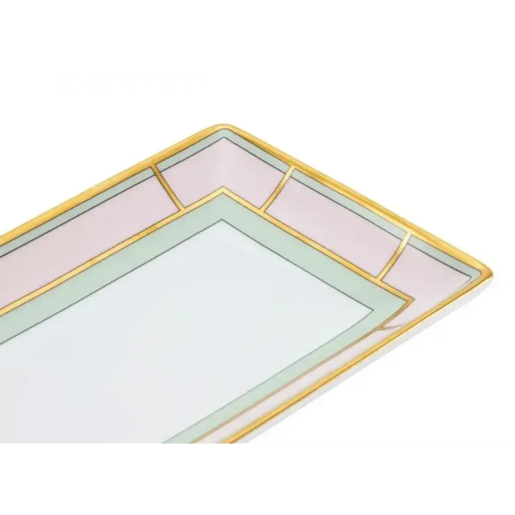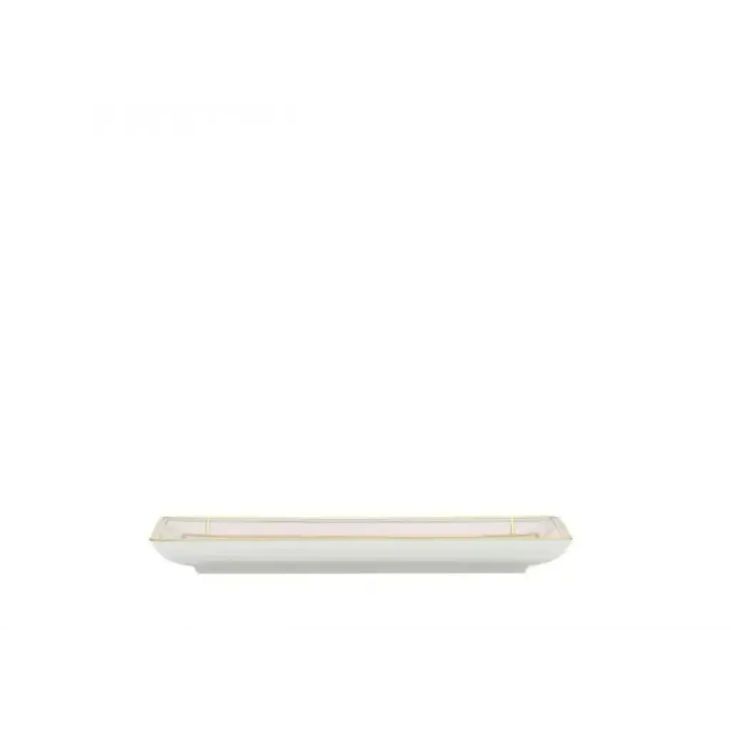 Rectangular porcelain change tray with Rosa and gold decoration. New Diva collection. The pink and green decoration is embellished with delicate gold threading, a signature of Ginori 1735. Versatile and dynamic, it is designed to be both a home décor accessory and to complete the table service as a tray for serving delectable hors d'oeuvres or micro-desserts. It comes wrapped in an exclusive luxury box that makes it a perfect gift. Sophisticated. Feminine. Vivacious. Elegant. Diva brings together the allure of a bygone era and a contemporary, modern design that celebrates the enduring glamour of the great movie divas. It is available in four pastel colors to be mixed & matched in unique and unpredictable arrangements.