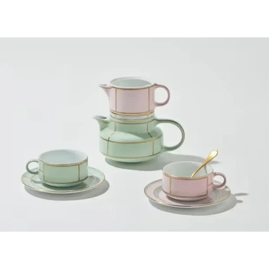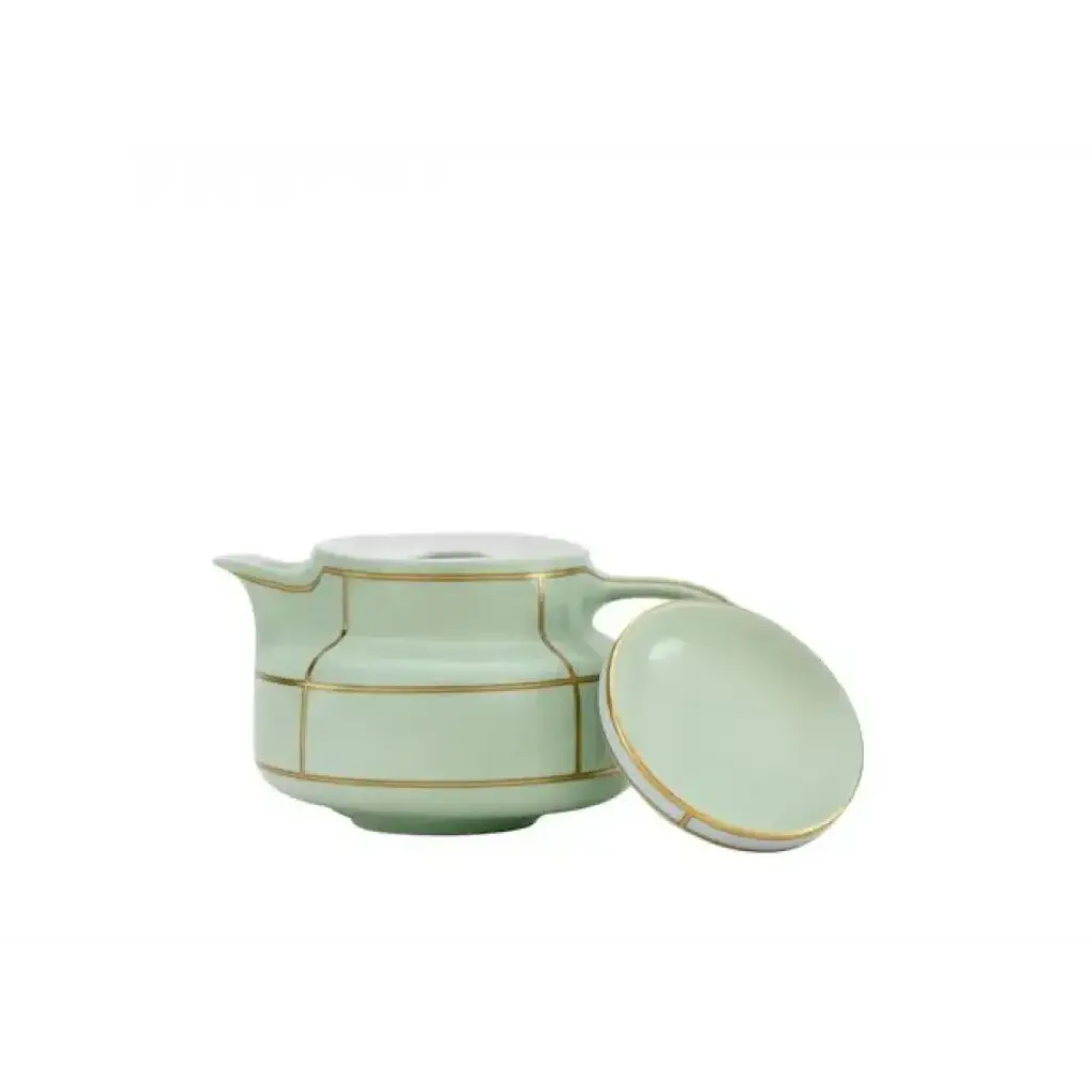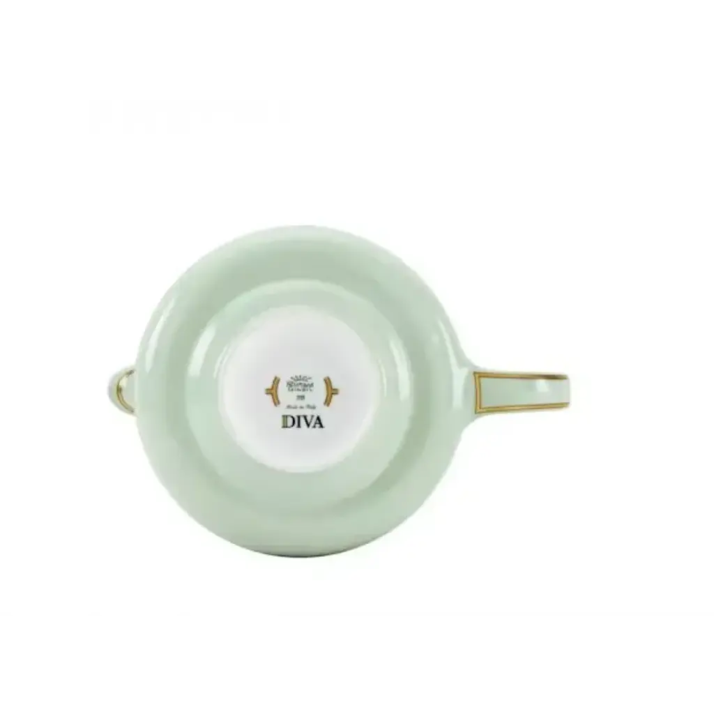 Porcelain teapot with Verde and gold decoration. New Diva collection. The innovative Colonna shape, Artistic Director Giovanni Gariboldi's icon of mid-century Italian design and functionality, hear features a green decoration enhanced with delicate gold threading. It complements the set of the same line, alongside the sugar bowl, milk pitcher, cups and plates, all of which are designed to be mixed & matched to create endless combinations of the four pastel hues available. Effervescent, sophisticated and dynamic, Diva captures the allure of a bygone era in a contemporary, modern concept that draws inspiration from the glamour of the silver screen divas of the 1950s. Extremely versatile and functional, it is available in a selection of tableware designed to be stacked in symmetrical compositions that can easily be stored in small spaces. An array of giftware items is also available to beautify the home with added elegance.