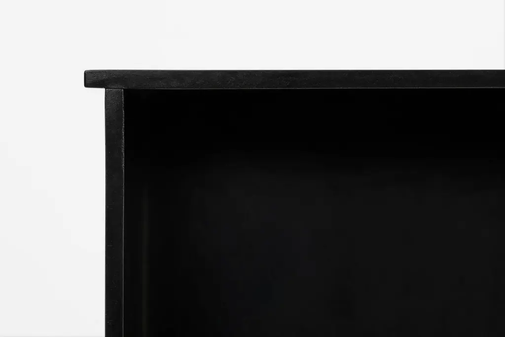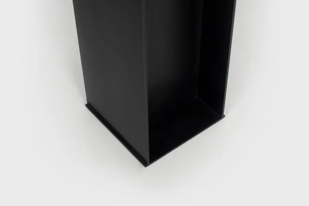 DK Pedestal in .25 inch thick aluminum plate that has been chemically blackened and waxed with black wax. Digitally cut aluminum plates are precisely welded and finished. The pedestal has a digitally-cut rubber recessed footpad.