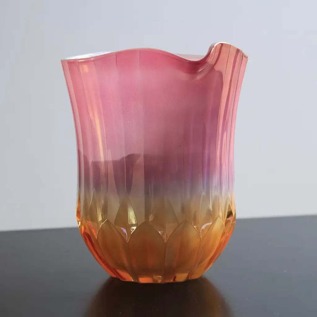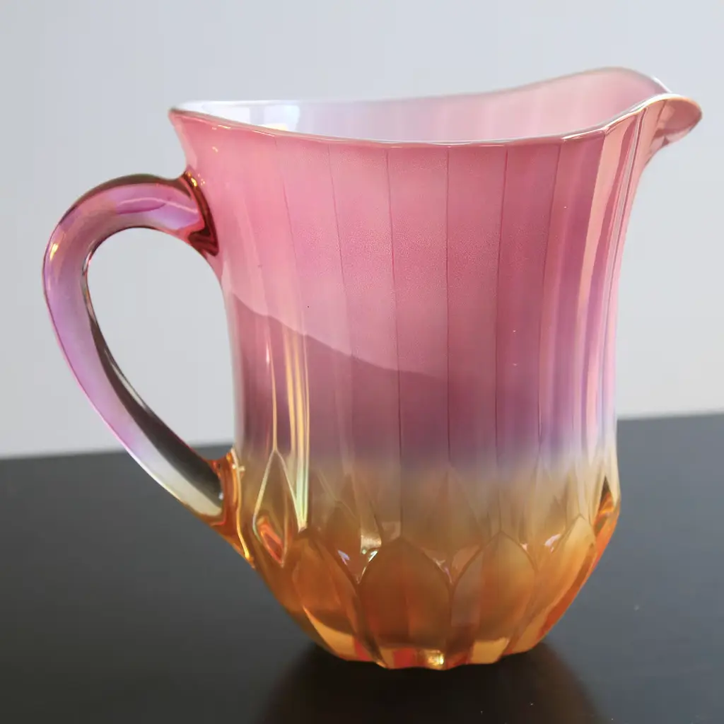 This captivating pitcher is a testament to glassmaking tradition and modern visual balance. Skillfully handcrafted of glass, it has a flared silhouette with a faceted, geometric base and vertically fluted sides that lead to a wide pouring rim and a curved handle. The white and orange color gradient of the glass pitcher elegantly contrasts with the multicolored glass handle, creating a dynamic color and textural contrast that gives the piece a unique, modern flair. This pitcher will add a refined touch of elegance for both everyday and festive table settings. It holds max 40 oz.
