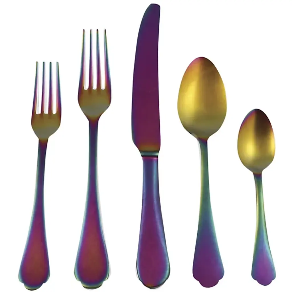 The Dolce Vita 20-Piece Flatware Set by Mepra brings a touch of luxury and elegance to your dining room. Made in Italy with 18/10 PVD coated stainless steel, it boasts a high-quality titanium coating for exceptional durability. Its design is perfect for a glam dining experience, combining style with functionality. This cutlery set is dishwasher safe, making it a practical choice for those seeking opulence and convenience in their dining space.