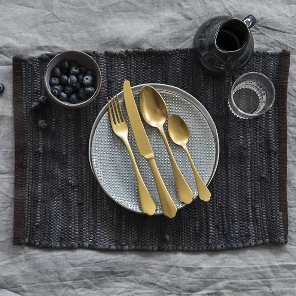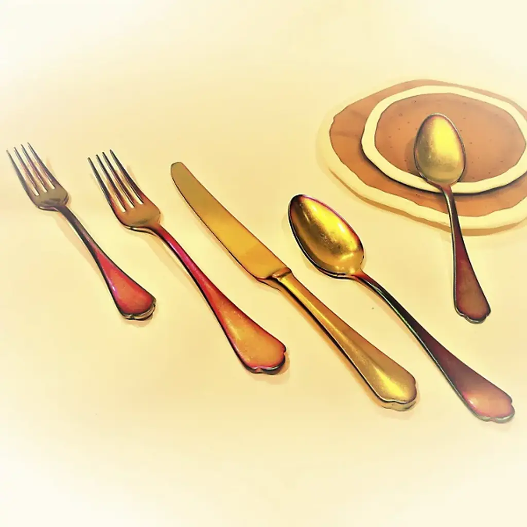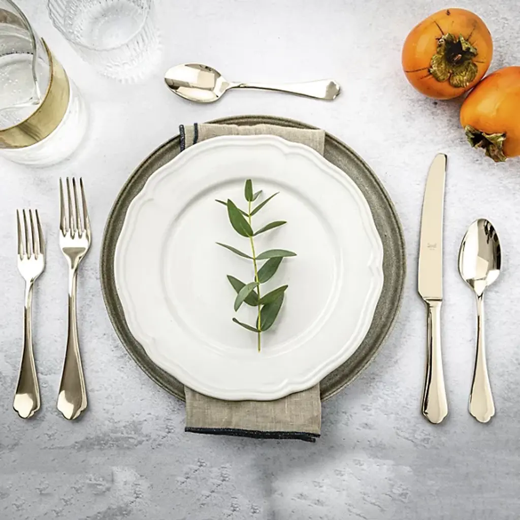 The Dolce Vita 20-Piece Flatware Set by Mepra brings a touch of luxury and elegance to your dining room. Made in Italy with 18/10 PVD coated stainless steel, it boasts a high-quality titanium coating for exceptional durability. Its design is perfect for a glam dining experience, combining style with functionality. This cutlery set is dishwasher safe, making it a practical choice for those seeking opulence and convenience in their dining space.