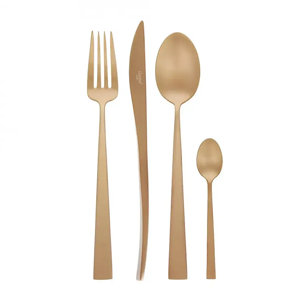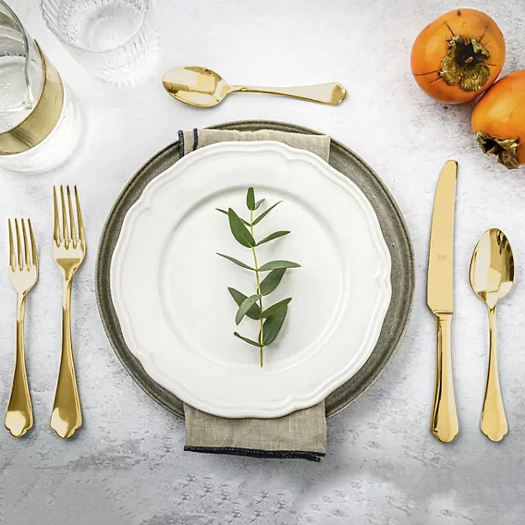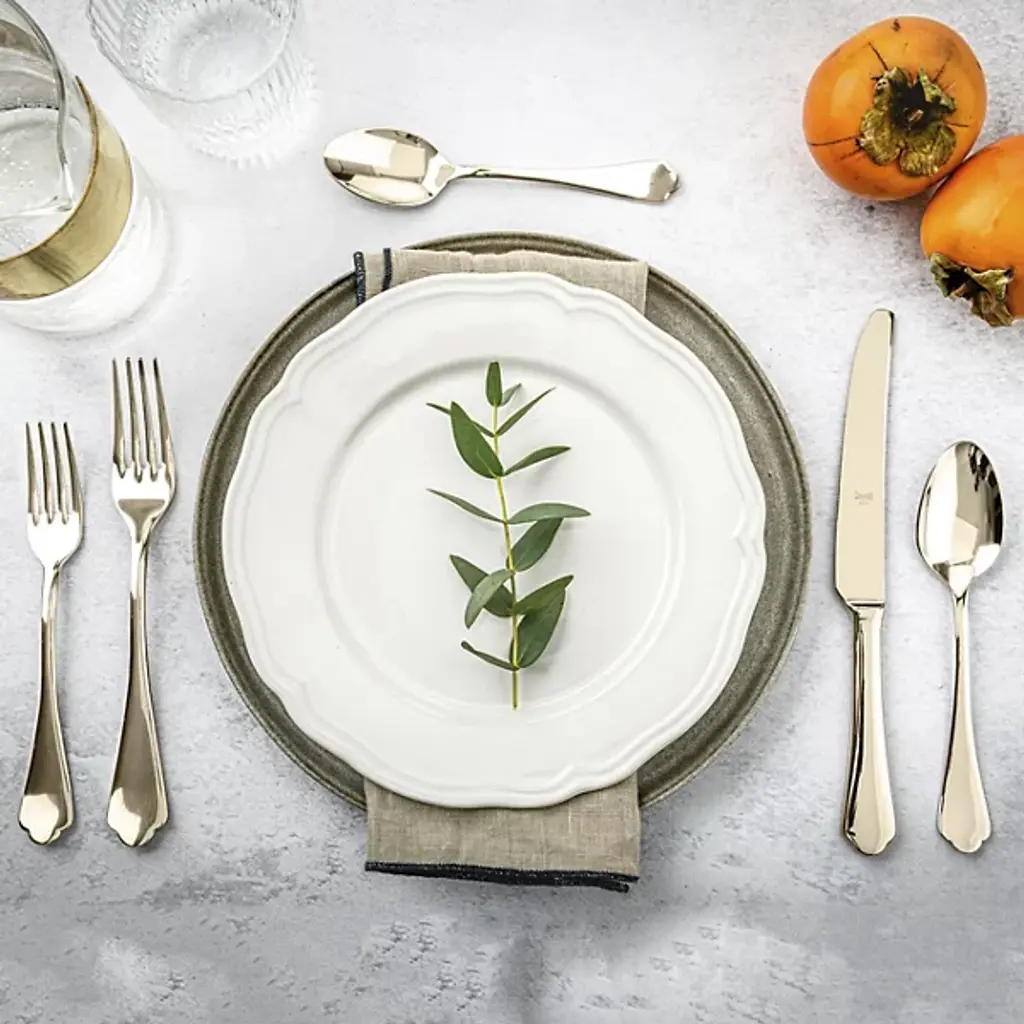 Introducing the Dolce Vita 5-Piece Flatware Place Setting by Mepra adds luxury to any dining experience. Crafted from durable 18/10 PVD-coated stainless steel, this set combines style and practicality. The knives feature double serration for lasting sharpness, while the dishwasher-safe design ensures easy cleaning. Made in Italy, the Dolce Vita Flatware set is a perfect blend of functionality and elegance, offering a sophisticated touch to everyday meals or special occasions.