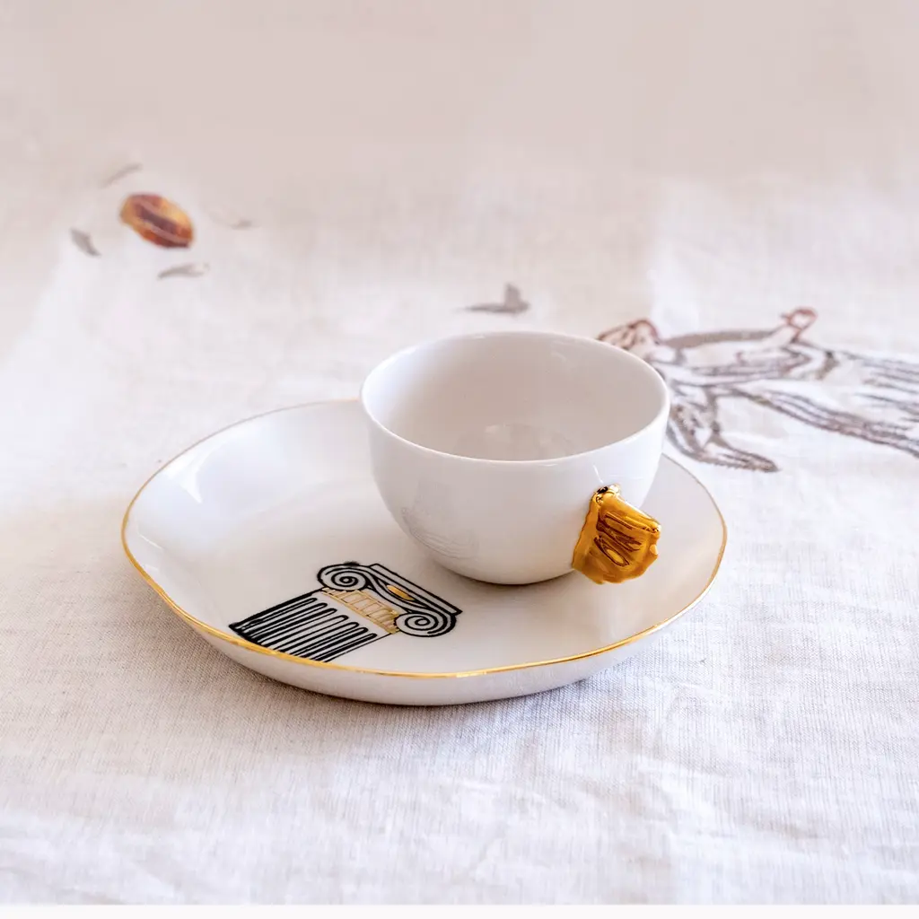 This magnificent cup can be used as functional piece of decor in any room of the house to display and store small objects, or on the dining table to serve small food. Its classic design is enhanced by the hand-applied colors that are delicate pastel at the base and cup and become vivid blue and red on the short stem. A precious thin band of pure gold accents each section of the piece, adding a luxurious touch to it.