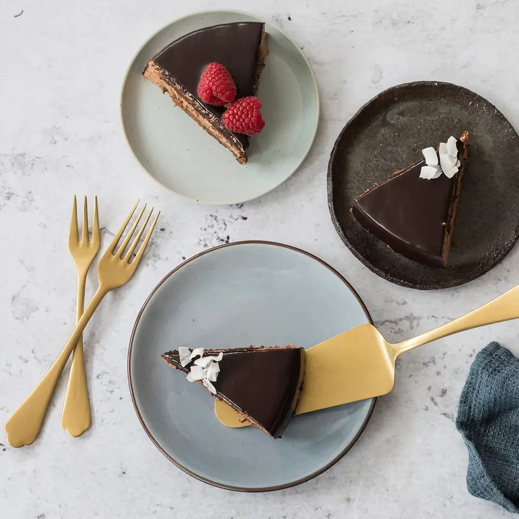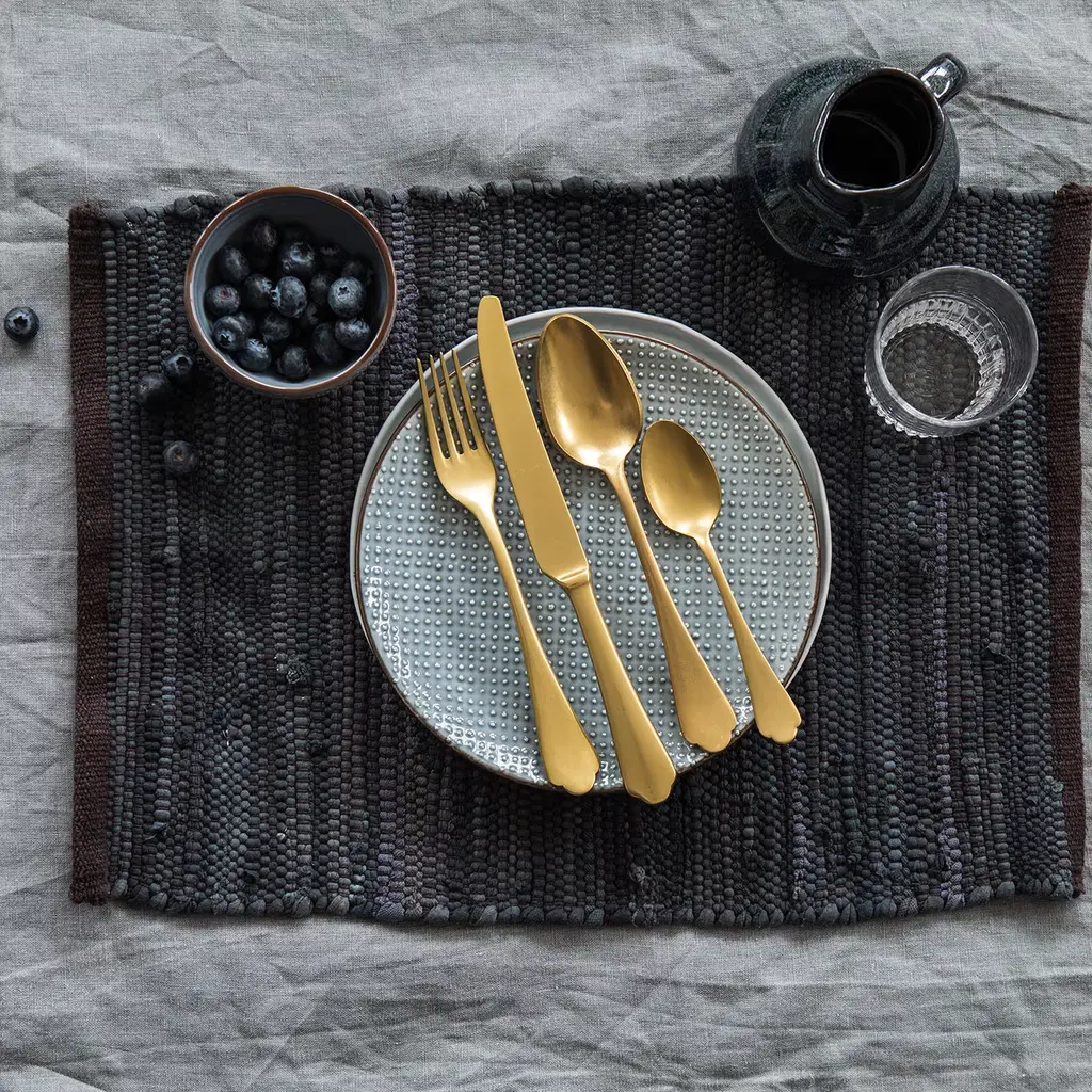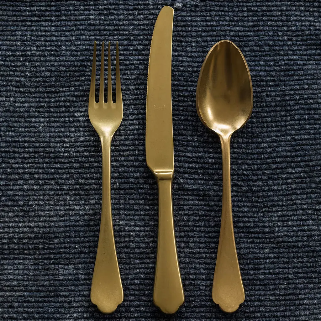 A modern take on the neo-Baroque style with an elegant and balanced shape, the Dolcevita Vintage Oro set includes a table fork (20.6 cm), a table knife (24 cm), a dessert spoon (17.8 cm), a dessert fork (17.8 cm) and a coffee spoon (15.6 cm) all finished in vintage gold. Made of 18/10 stainless steel, this set is highly resistant to corrosion, stains, and oxidation thanks to the protective titanium-based coating applied with the innovative PVD technique. A personalized engraved logo can be added upon request to the Concierge.