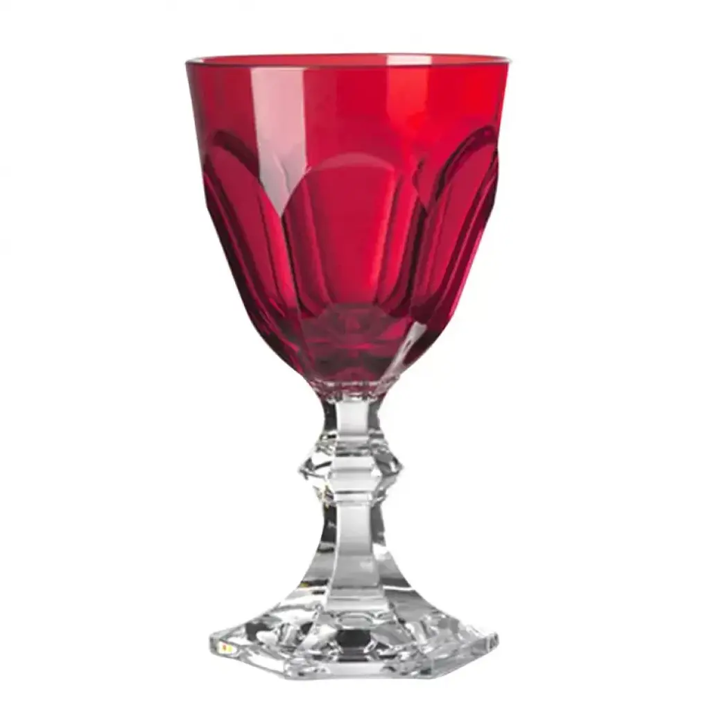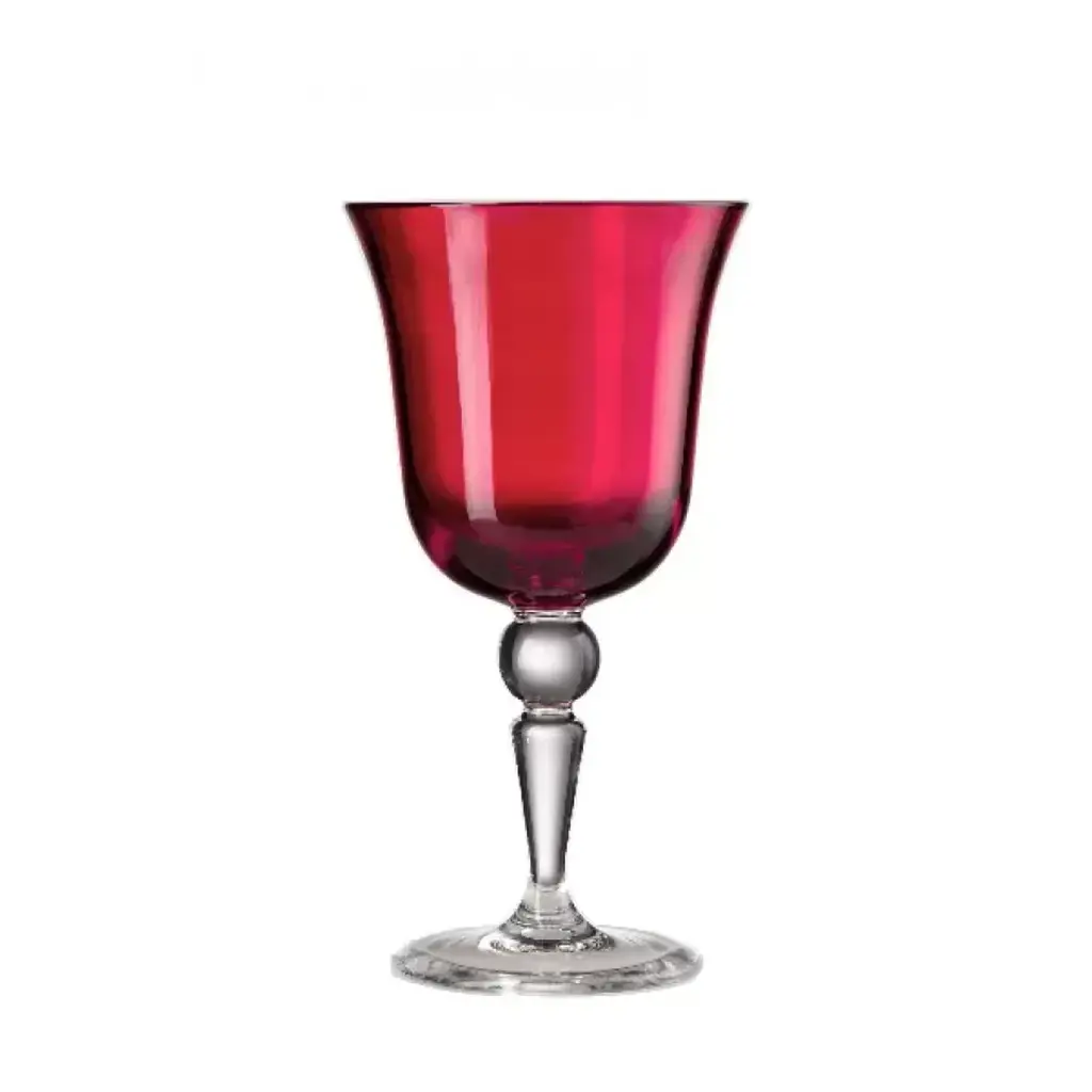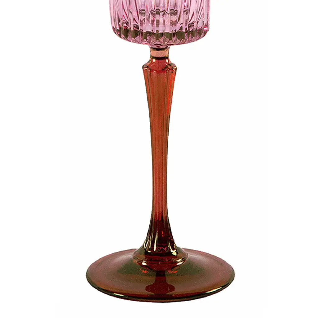 An intense blood-orange shade contrasting with a transparent pink tone is the daring chromatic selection making this set of two stemmed water glasses stand out. Emphasized by an iridescent gleam, the glasses feature bowls with an intended design and slender stems with a ribbed texture. Wine and flute counterpart sets are also available in the Artemest catalog. Please wash by hand only.