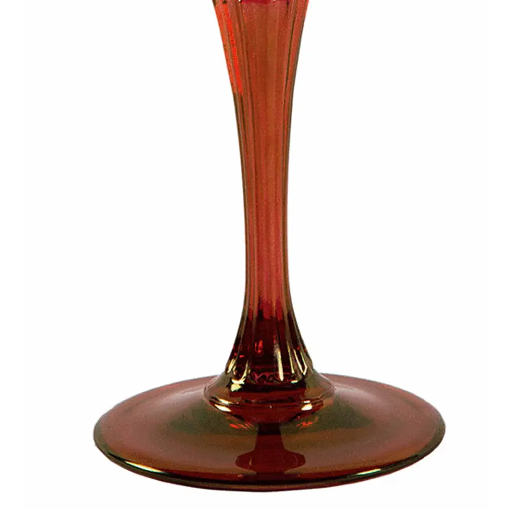 A striking iridescent gleam and a daring contrast of pink bowls and orange stemmed bases characterize this vibrant set of two wine glasses. The ribbed design enlivens the slender stem, while the V-shaped bowls showcase an intended texture favoring grip and stunning interplay of reflections. Please hand wash only. Additional color options are listed in the Artemest catalog.