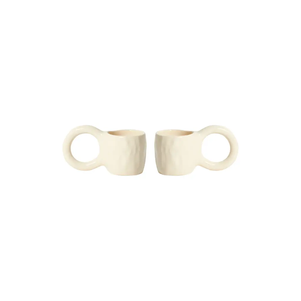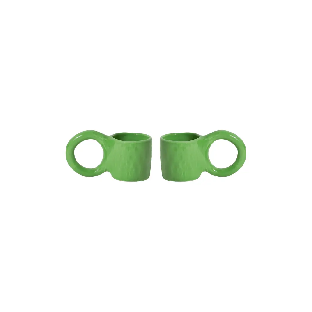 Enjoy your favorite morning or afternoon espresso from the Donut Espresso Cup, designed by ceramic artist Pia Chevalier for Petite Friture. Inspired by the world of baking, these cups feature signature, oversized handles that mimic doughnut pastry, and an enamel finish for a sugar-glazed look. Standing out for their handcrafted appearance, this set is perfect for gifting. Highlights
