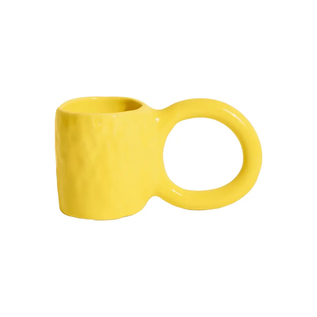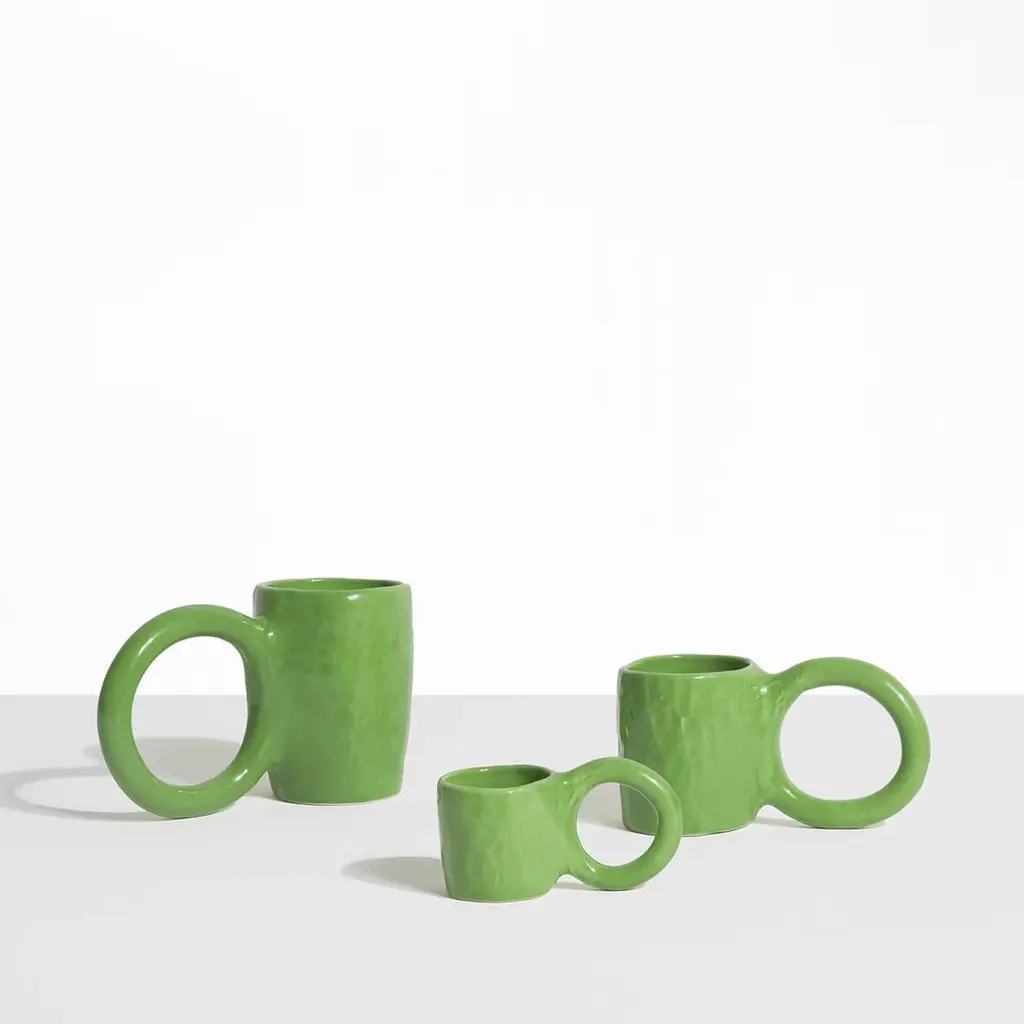 Drawing her inspiration from the world of baking, designer Pia Chevalier imagined her mugs as a collection of sweet treats. The oversized handle emulates the shape of a doughnut, and the enamel finish gives the piece a sugar-glazed coating look. The Pistachio mug is available exclusively on our website. Made in Portugal, the design of these ceramic mugs is grounded in craftsmanship. The hand-produced enameling makes each piece unique. The thick texture echoes the voluptuousness of a doughnut, and the mug’s volume offers a generous 8cm-high countenance for tea, coffee, and other beverages. Features